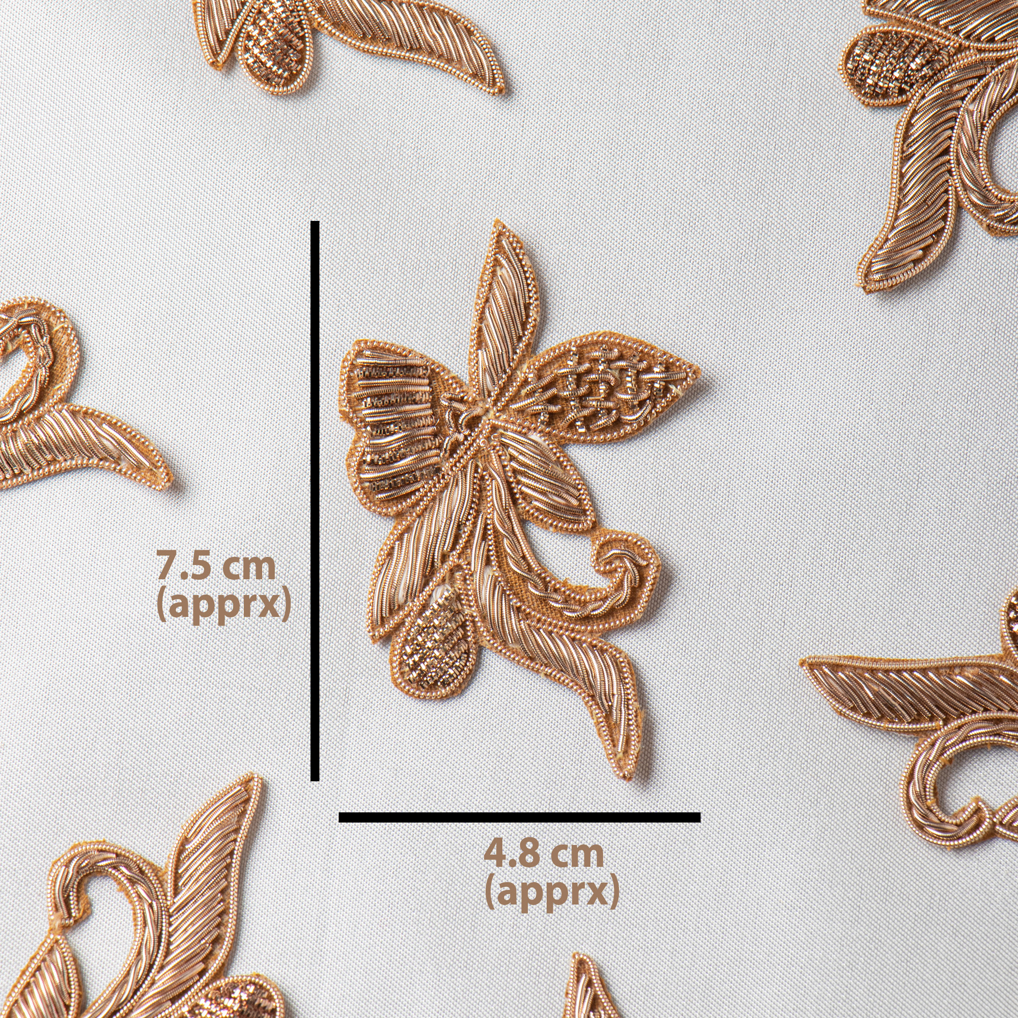 Add a touch of luxury to your ethnic creations with this handcrafted Zardozi floral applique. Designed in an elegant antique gold finish, this motif is made using high-quality zardozi metal thread work. The intricate handcrafted detailing makes it perfect for enhancing saree borders, blouse sleeves, dupattas, lehengas, bags, potlis, and couture outfits. This patch is lightweight, easy to sew, and brings a rich designer look to any fabric.