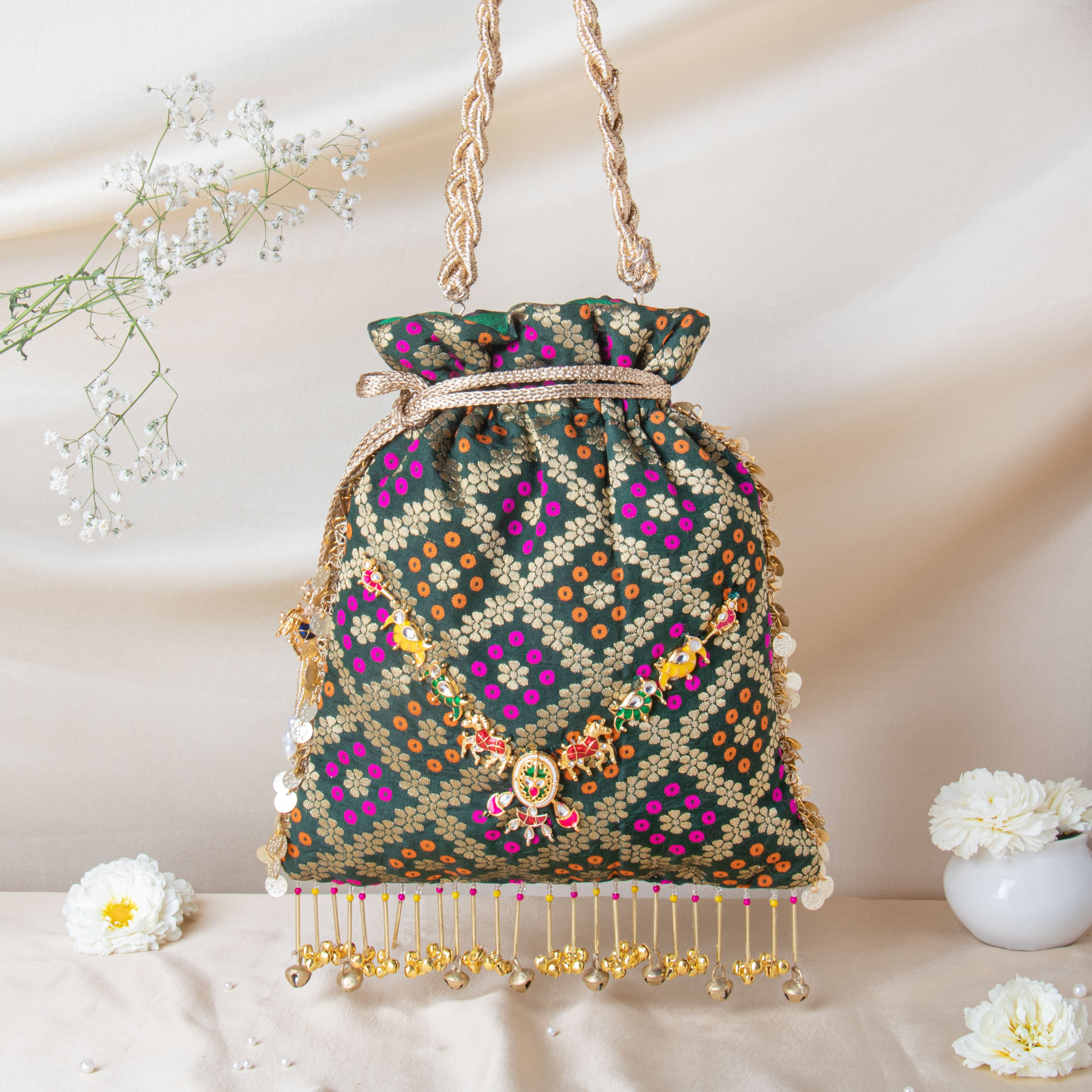 A bold and luxurious creation, this designer potli is crafted on a rich Deep Green Banarasi Brocade base, featuring an intricate interplay of golden zari and vibrant floral weaving. The textured brocade fabric provides a royal sheen that beautifully enhances the central masterpiece: a hand-embroidered Meenakari Elephant Brooch adorned with ruby-red stones. The silhouette is further elevated with a playful fringe of golden ghungroos and a coin-lace border, creating a regal and timeless masterpiece that celebrates Indian heritage. Versatility: