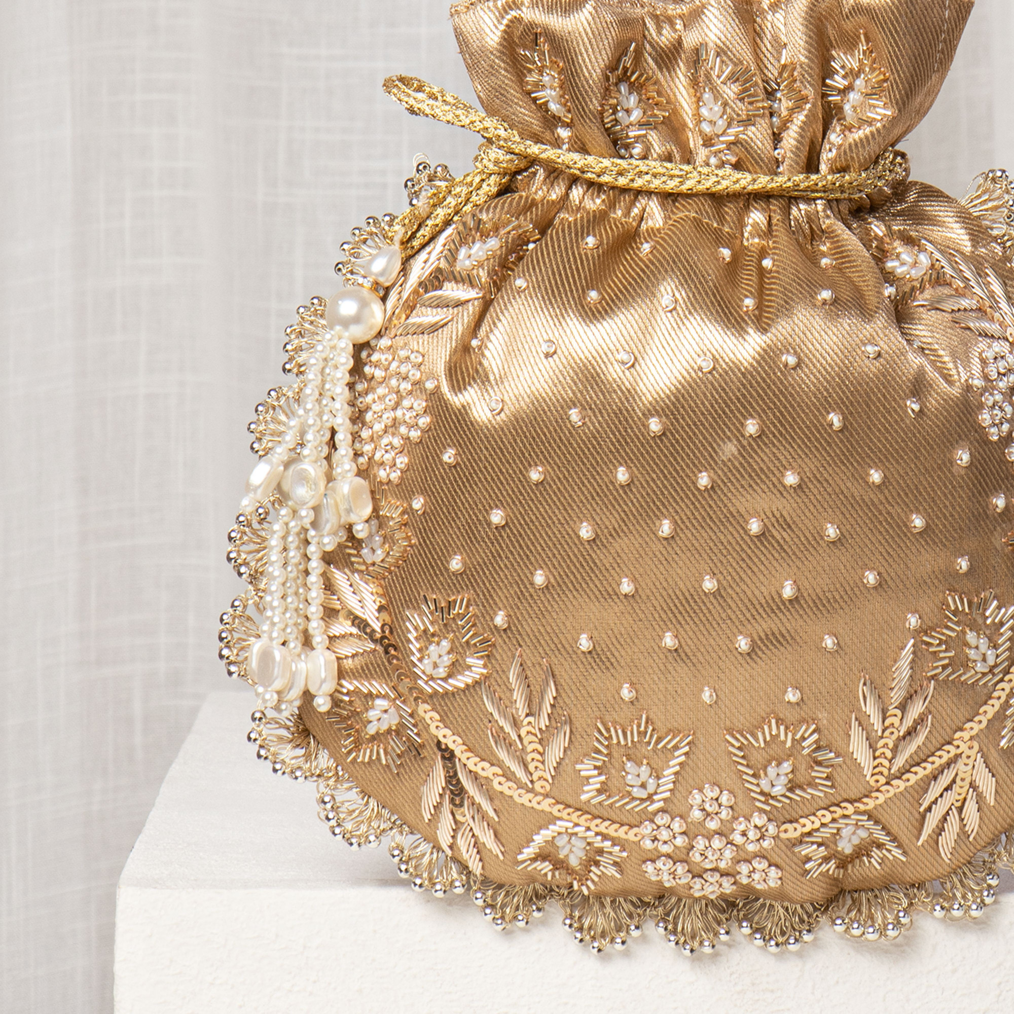 Design: Crafted from premium, high-sheen Antique -Gold Tissue Silk fabric featuring an exquisite and intricate floral thread embroidery. The design is enhanced with lustrous pearl accents and a unique hand-beaded scalloped border that creates a royal and vintage silhouette. Versatility: Designed with a classic drawstring closure and a luxurious double-strand pearl handle, making it easy to carry as a high-fashion handheld accessory for any traditional or fusion ethnic outfit. Space: Thoughtfully sized to comfortably hold your celebration essentials, including a large smartphone, makeup touch-ups, keys, and cash. Closure: Features a smooth, reinforced gold metallic drawstring mechanism with cascading pearl-fringe tassels to ensure your belongings stay secure while adding a graceful, festive flair. Occasion: An ideal choice for traditional Indian weddings, reception parties, or as a sophisticated shagun bag for Gifting. Its unique bronze-gold tone makes it a perfect pick for Brides and guests who prefer understated luxury.