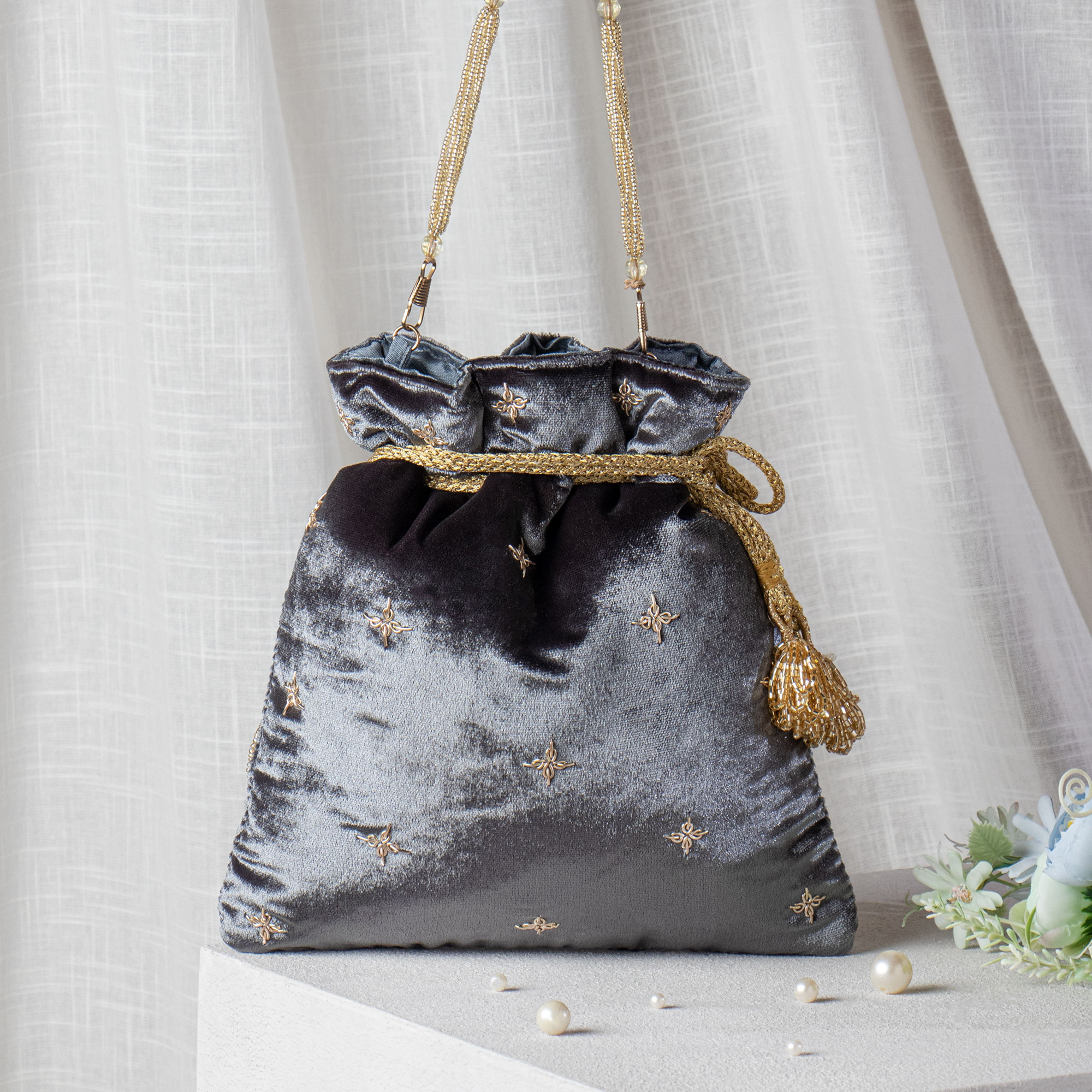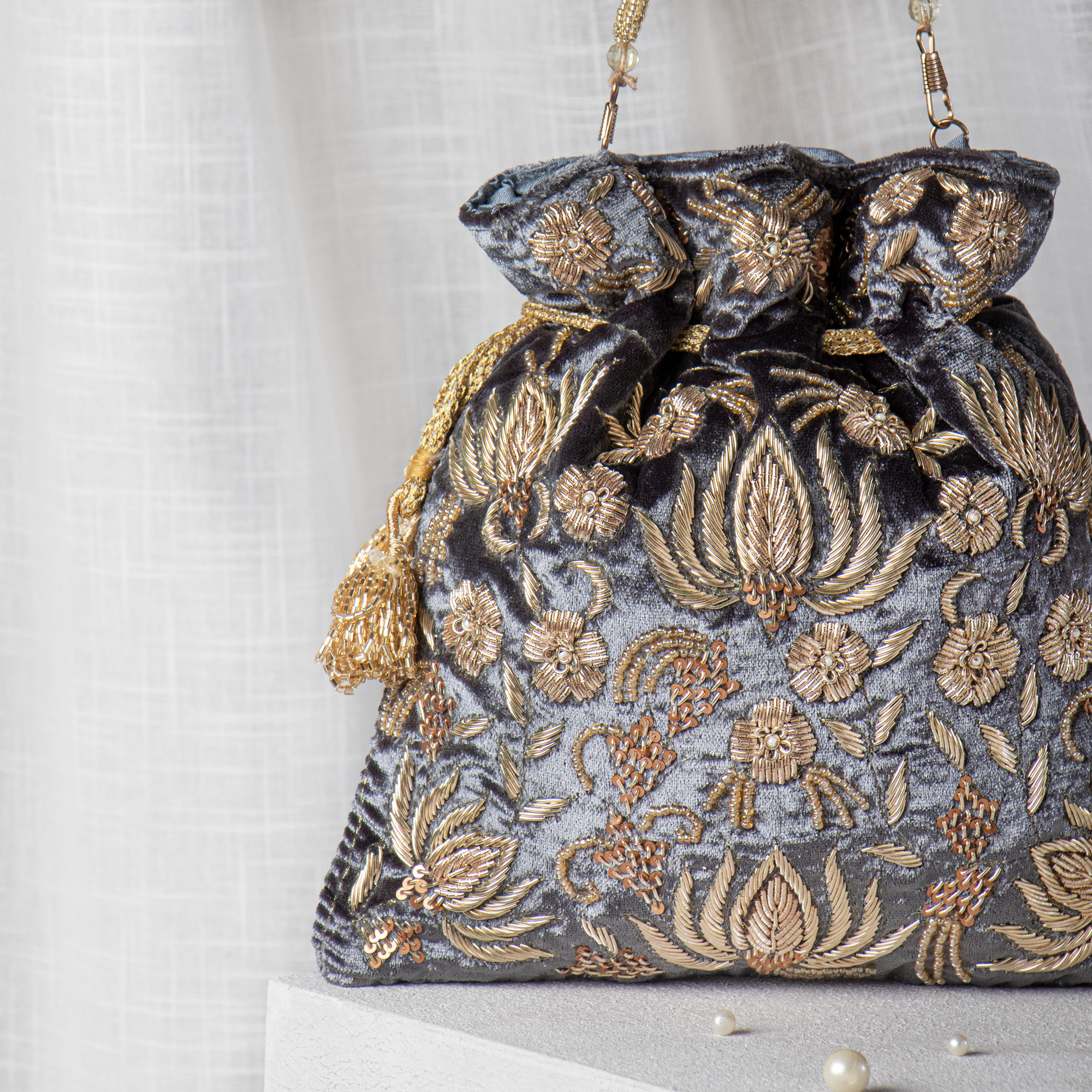 This elegant grey Potli Bag is crafted on premium velvet fabric and features intricate Zardozi embroidery enhanced with sequins and pearls. A graceful pearl-beaded handle lends a refined and luxurious touch. The drawstrings are finished with tiny tassel detailing, elevating the handcrafted appeal. Designed to be both stylish and functional, it comfortably holds your essentials. Perfect for weddings, festive occasions, and special celebrations. Available in multiple colors with the same detailed craftsmanship.