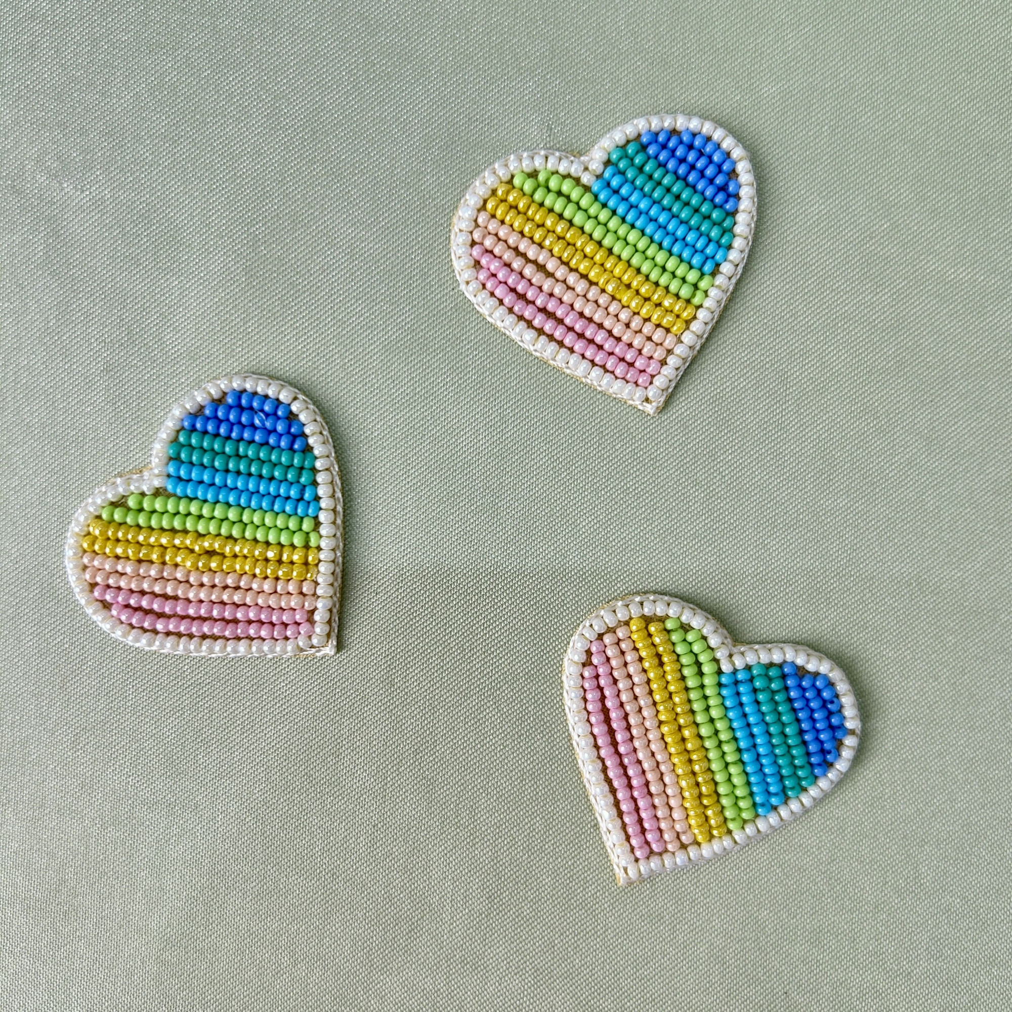 A pastel heart-shaped beadwork patch, hand-embroidered with colourful beads for a playful and cheerful look. Ideal for kidswear, casual outfits, bags, and creative embellishments.