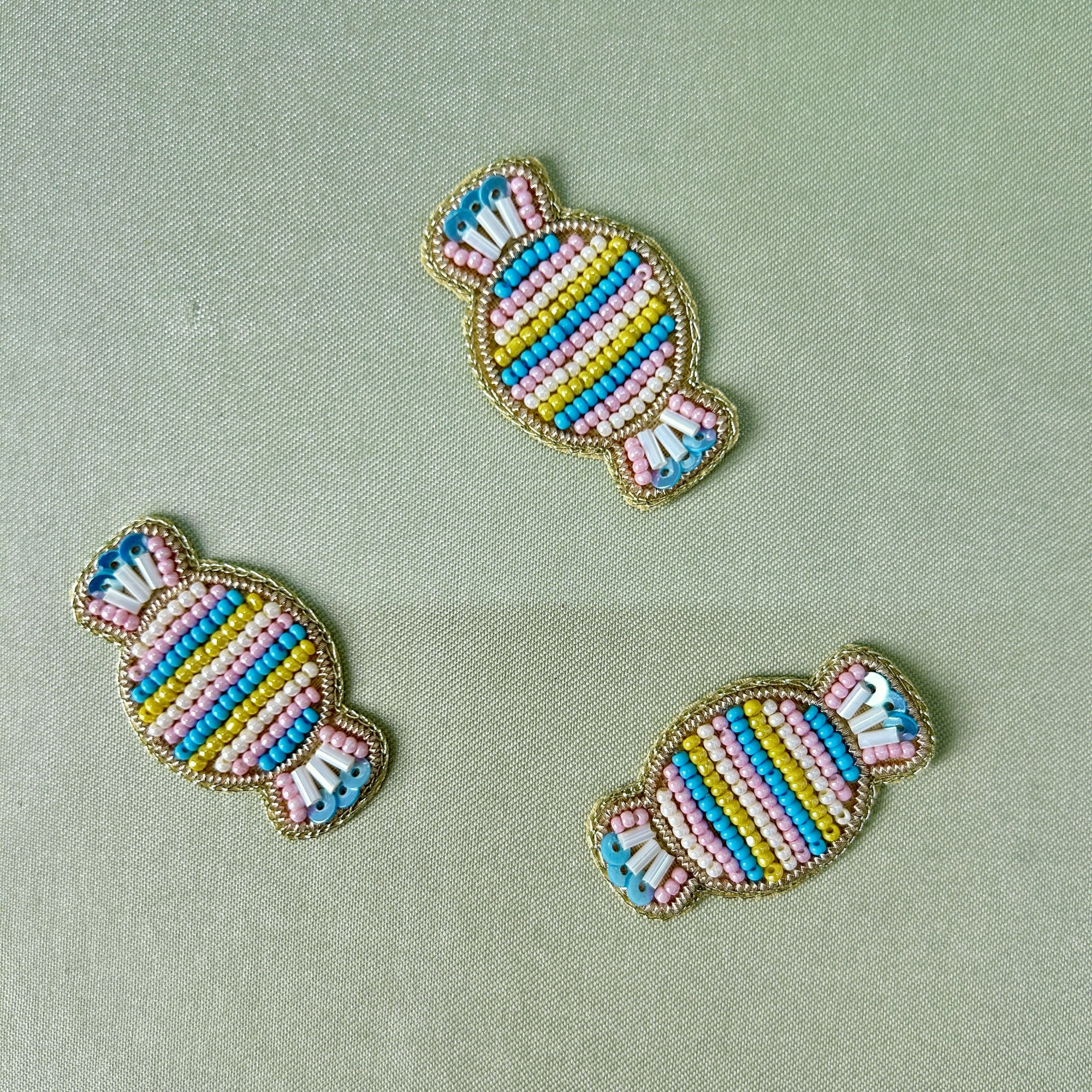 This colourful toffee-shaped beadwork patch is fun, playful, and hand-embroidered with vibrant beads. Perfect for kidswear, bags, and casual funky looks.