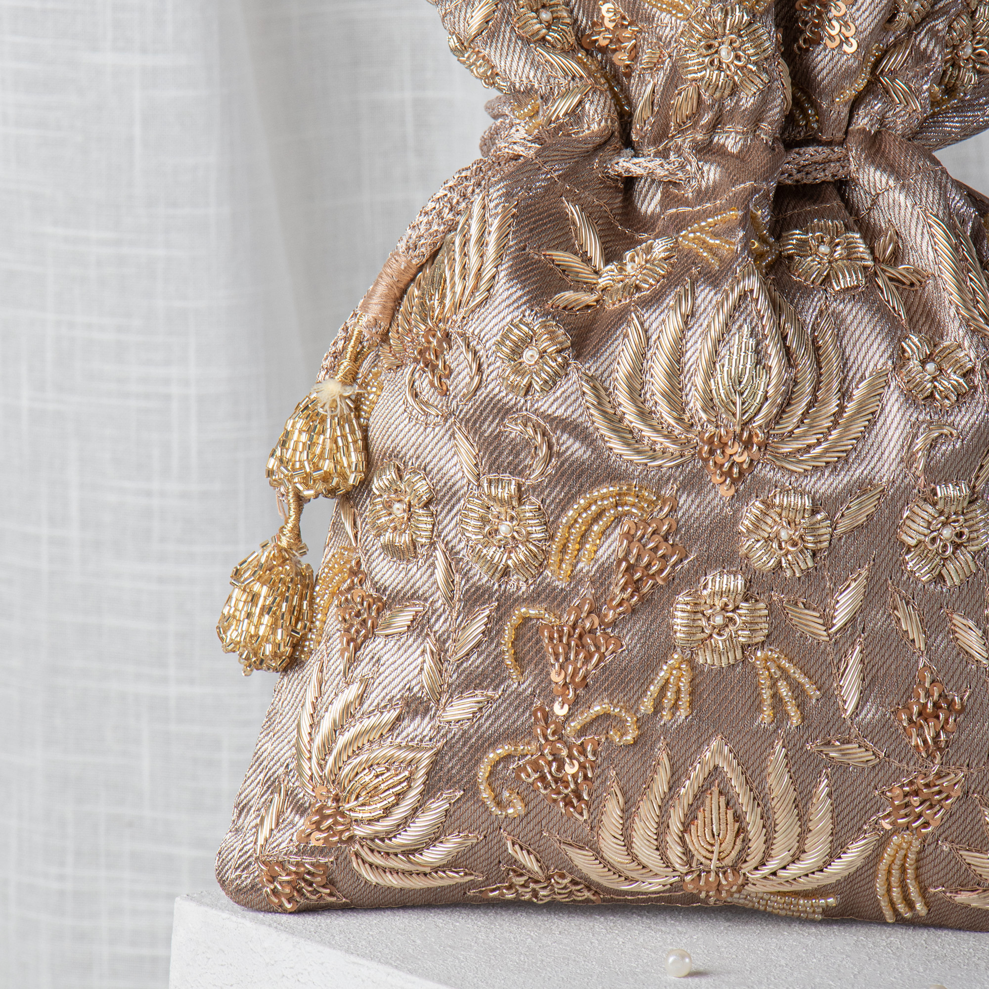 This elegant copper golden Potli Bag is crafted on premium tissue fabric and features intricate Zardozi embroidery enhanced with sequins and pearls. A graceful pearl-beaded handle lends a refined and luxurious touch. The drawstrings are finished with tiny tassel detailing, elevating the handcrafted appeal. Designed to be both stylish and functional, it comfortably holds your essentials. Perfect for weddings, festive occasions, and special celebrations. Available in multiple colors with the same detailed craftsmanship.