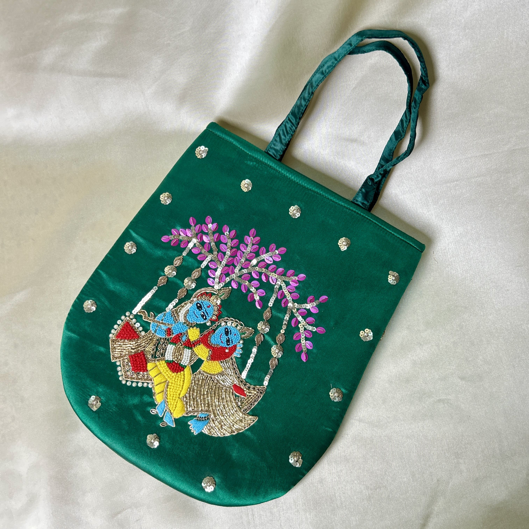 Dark Green Hand-Embroidered Radha-Krishna Satin Silk Handbag with French Knot Detailing