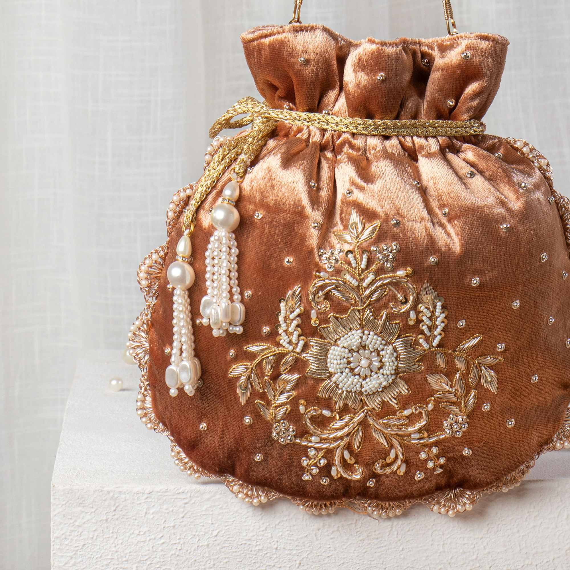 Design: Crafted from high-quality, plush rust brown velvet fabric featuring an exquisite and intricate floral pearl and zardozi embroidery that adds a traditional yet royal touch to your look. Versatility: Designed with a classic drawstring closure and comfortable pearl-beaded wrist handle, making it easy to carry as a stylish handheld accessory for any ethnic outfit. Space: Thoughtfully sized to comfortably hold your celebration essentials, including a large smartphone, makeup touch-ups, keys, and cash. Closure: Features a smooth, reinforced drawstring mechanism with premium decorative pearl-cluster tassels to ensure your belongings stay secure while adding a festive flair. Occasion: An ideal choice for traditional Indian weddings, festive Puja celebrations, or as a sophisticated shagun bag for Gifting. Perfect for Brides and wedding guests alike.