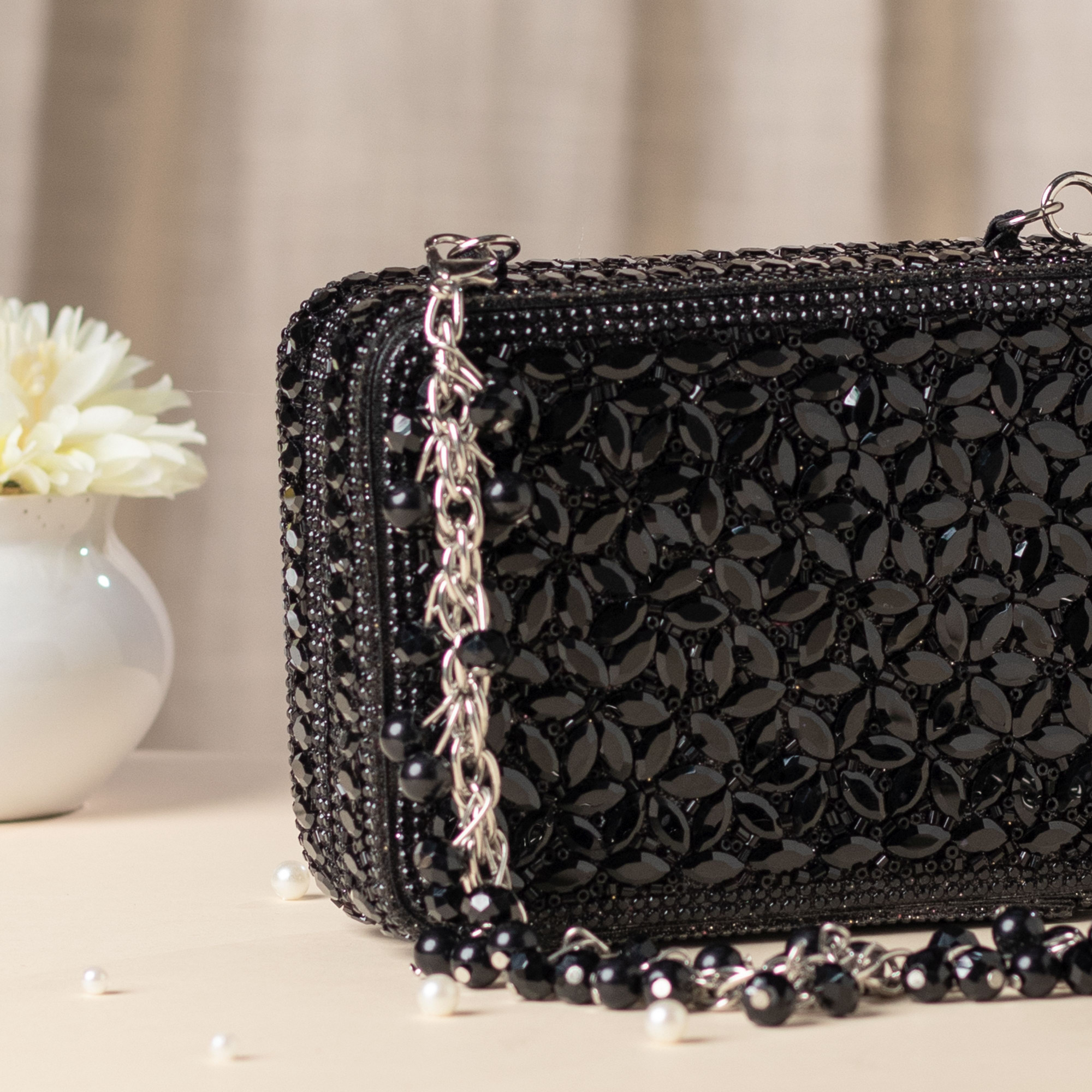 Black Crystal Embellished Mini Evening Bag with Beaded Chain