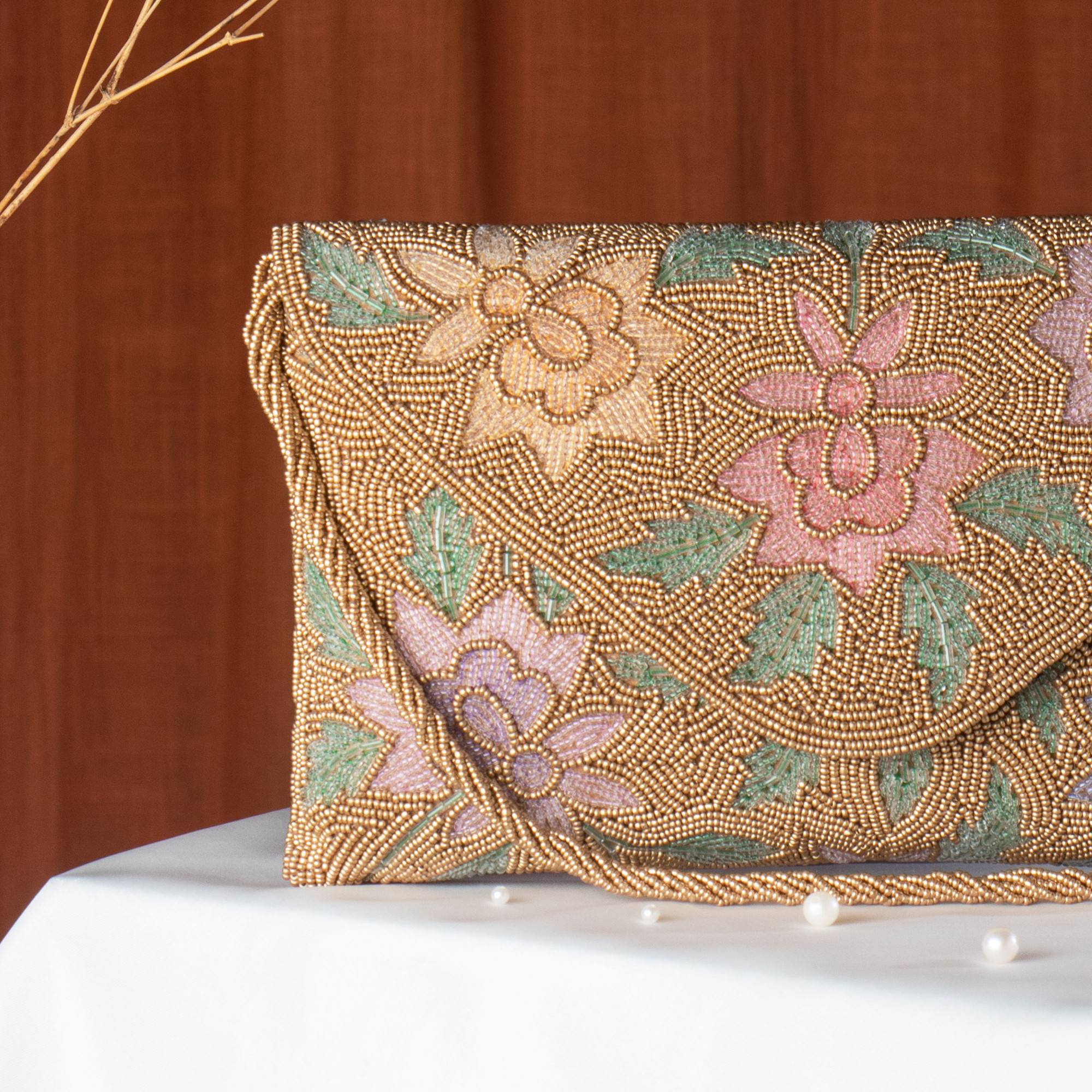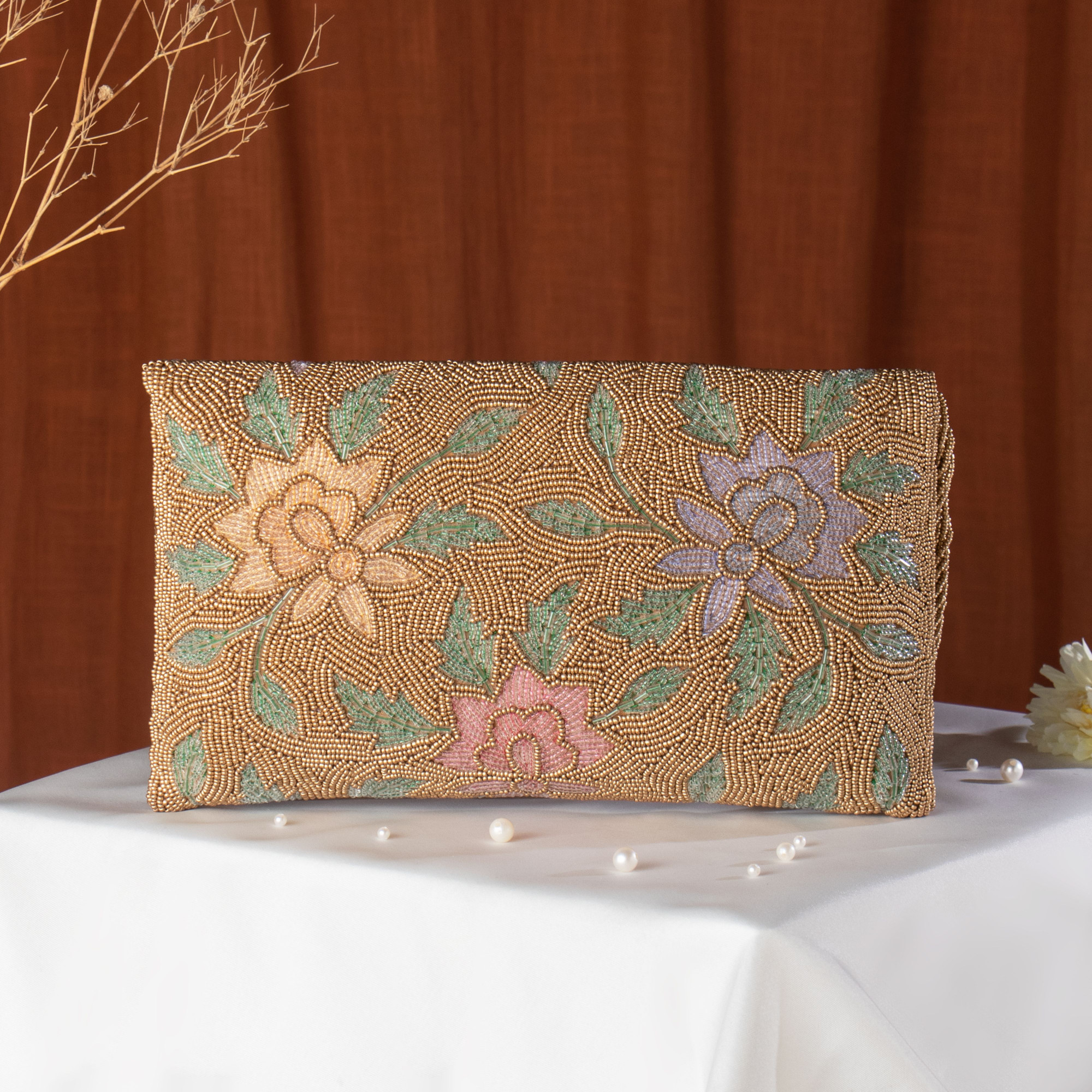 Add a touch of regal elegance to your wardrobe with the Shubhams Ethnic Copper Clutch. This exquisite accessory is designed to complement both traditional Indian wear and contemporary evening outfits. Key Features: