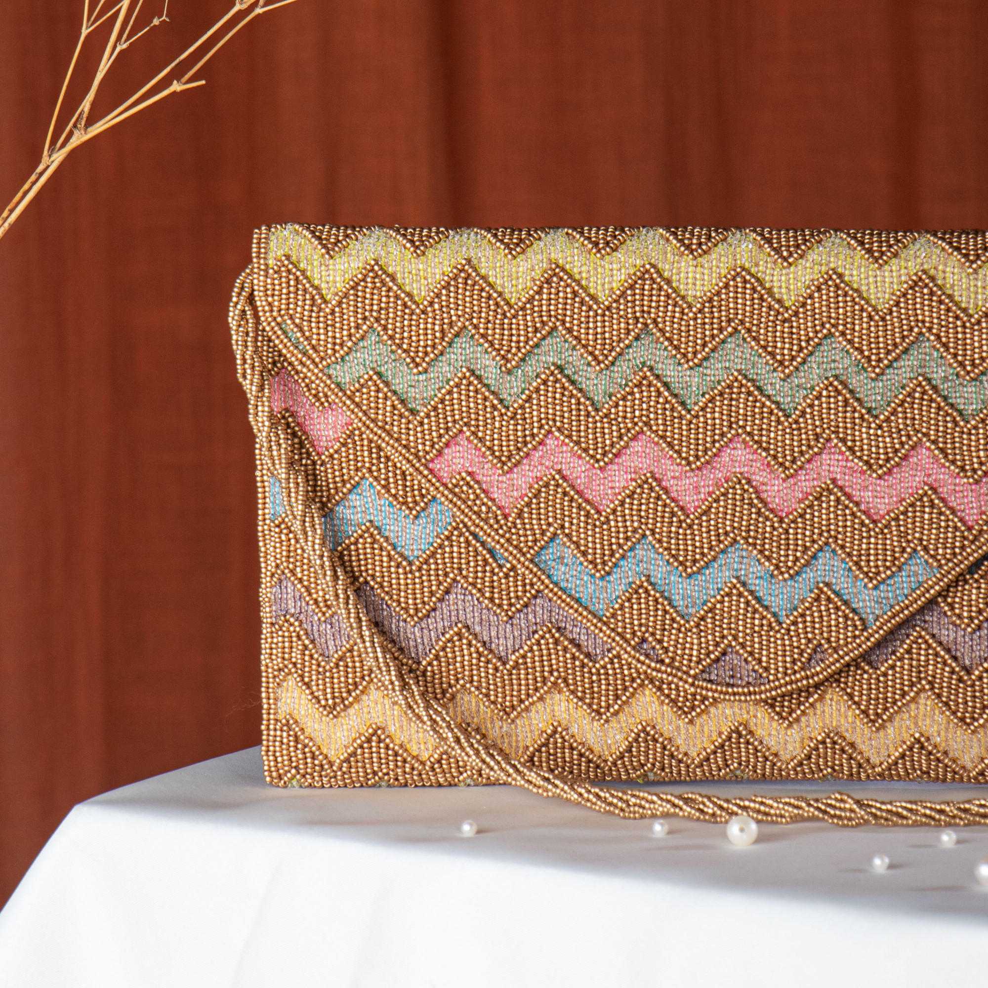 Elevate your evening look with our handcrafted chevron envelope clutch. Featuring a striking zigzag pattern in a palette of pastel and bold hues, this bag is designed to be the focal point of any outfit. The sleek rectangular silhouette offers ample space for your essentials, while the intricate beadwork/embroidery showcases premium craftsmanship. Perfect for weddings, parties, or a sophisticated night out.