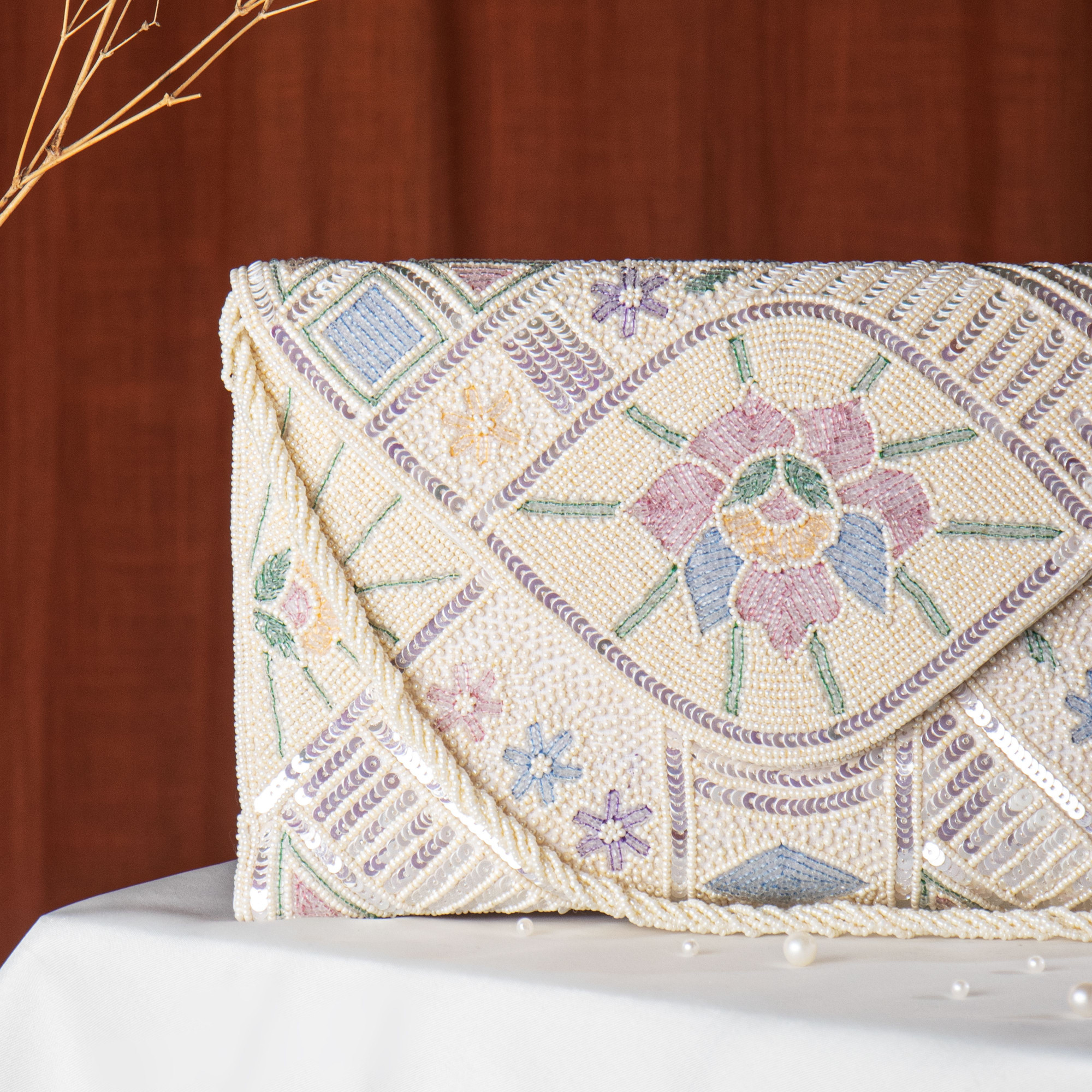 Off White Hand-Embroidered Geometric Beaded Clutch Bag - Ivory & Pastel Floral