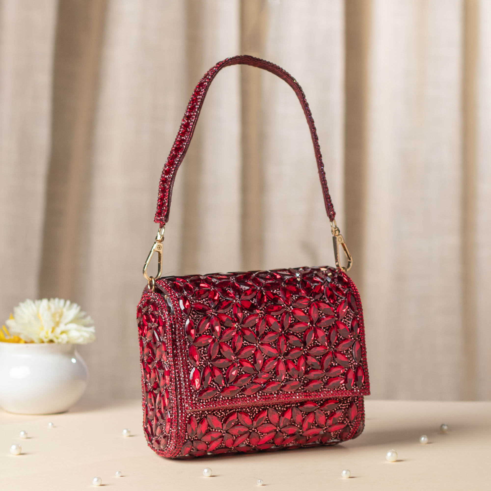 Make a grand entrance with this exquisite Red Crystal Clutch. Handcrafted for the modern woman who loves a touch of traditional royalty, this bag is adorned with shimmering crystals that catch the light from every angle.