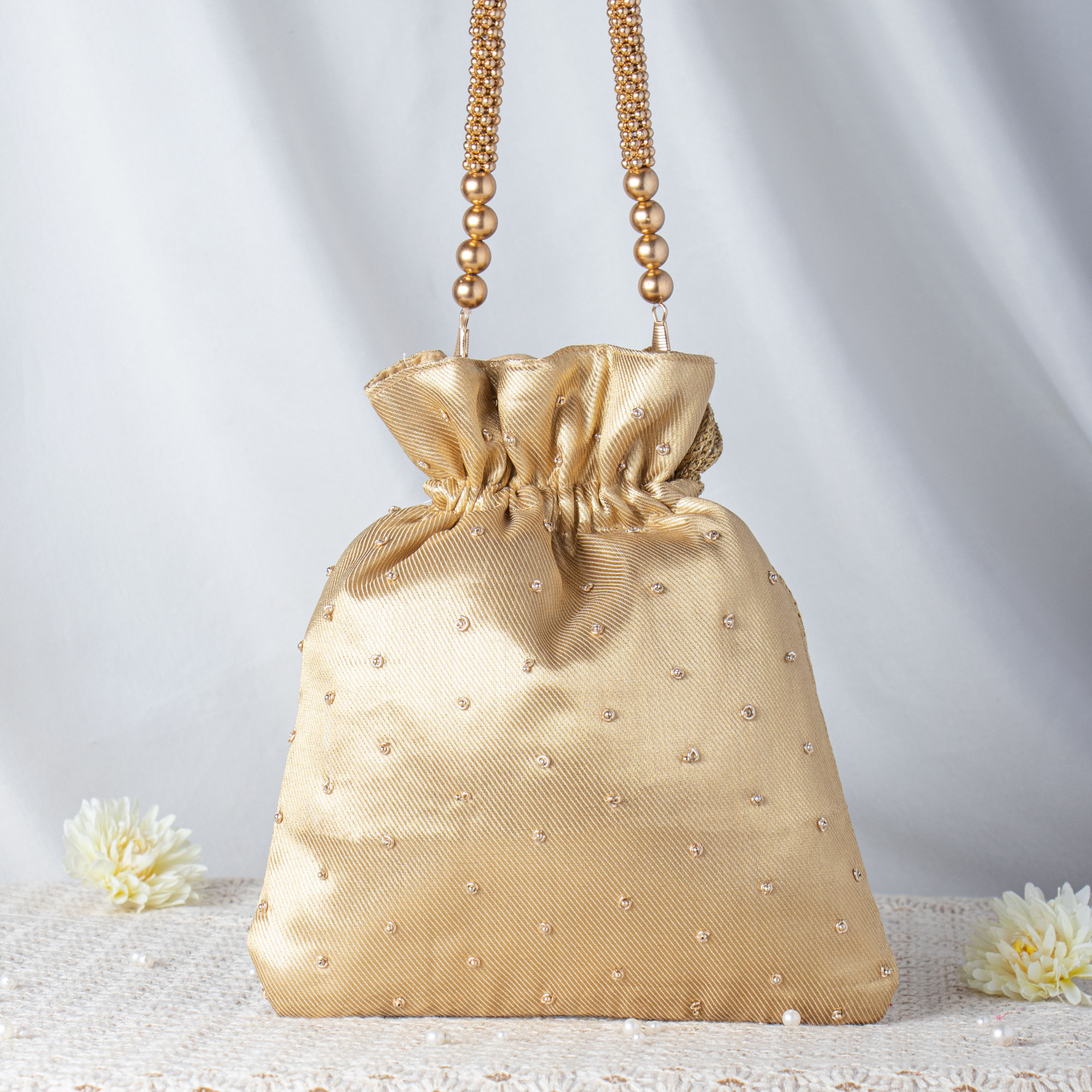 Design: A masterpiece of classic elegance, this luxury champagne gold potli is crafted on a premium textured tishu base. It features exquisite hand-applied Zardosi embroidery and shimmering stone-work patterns that bloom across the fabric. The delicate floral motifs and fine metallic threadwork create a sophisticated, radiant glow that epitomizes royal Indian craftsmanship. Versatility: Comes with a striking dual-textured metallic beaded handle, designed to be carried comfortably on the wrist. Its neutral champagne gold palette is a versatile essential, effortlessly pairing with everything from golden bridal lehengas to elegant evening cocktail sarees. Space: Thoughtfully designed with a spacious interior, it easily fits a large smartphone, essential makeup, keys, and cash, ensuring you have everything you need while maintaining a sleek, elegant profile. Closure: Features a secure, smooth-glide golden braided drawstring system, finished with ornate multi-tiered metallic tassels (latkans) that add a refined, regal touch to the overall design. Occasion: The perfect accessory for the "Classic Bride." Ideal for wedding receptions, sangeet ceremonies, grand festive parties, or as a high-end gift for bridesmaids and trousseau collections.