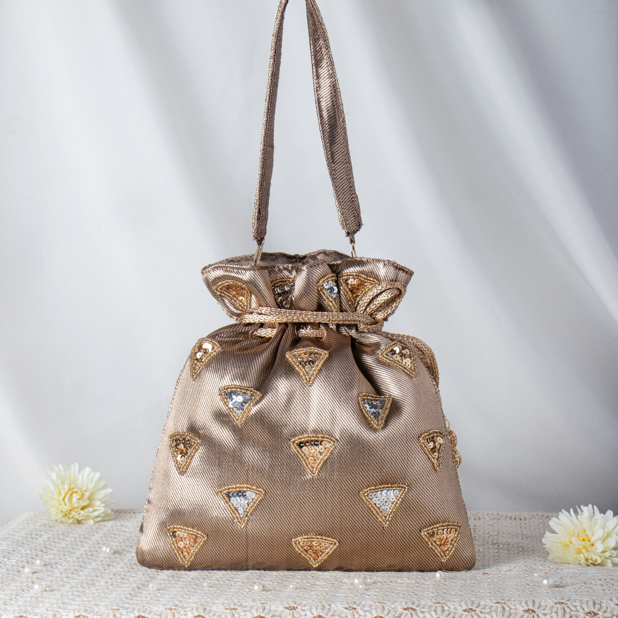 Closure: Secured by a reinforced, premium drawstring system with heavy metallic beaded tassels that complement the bag’s high-glamour finish.