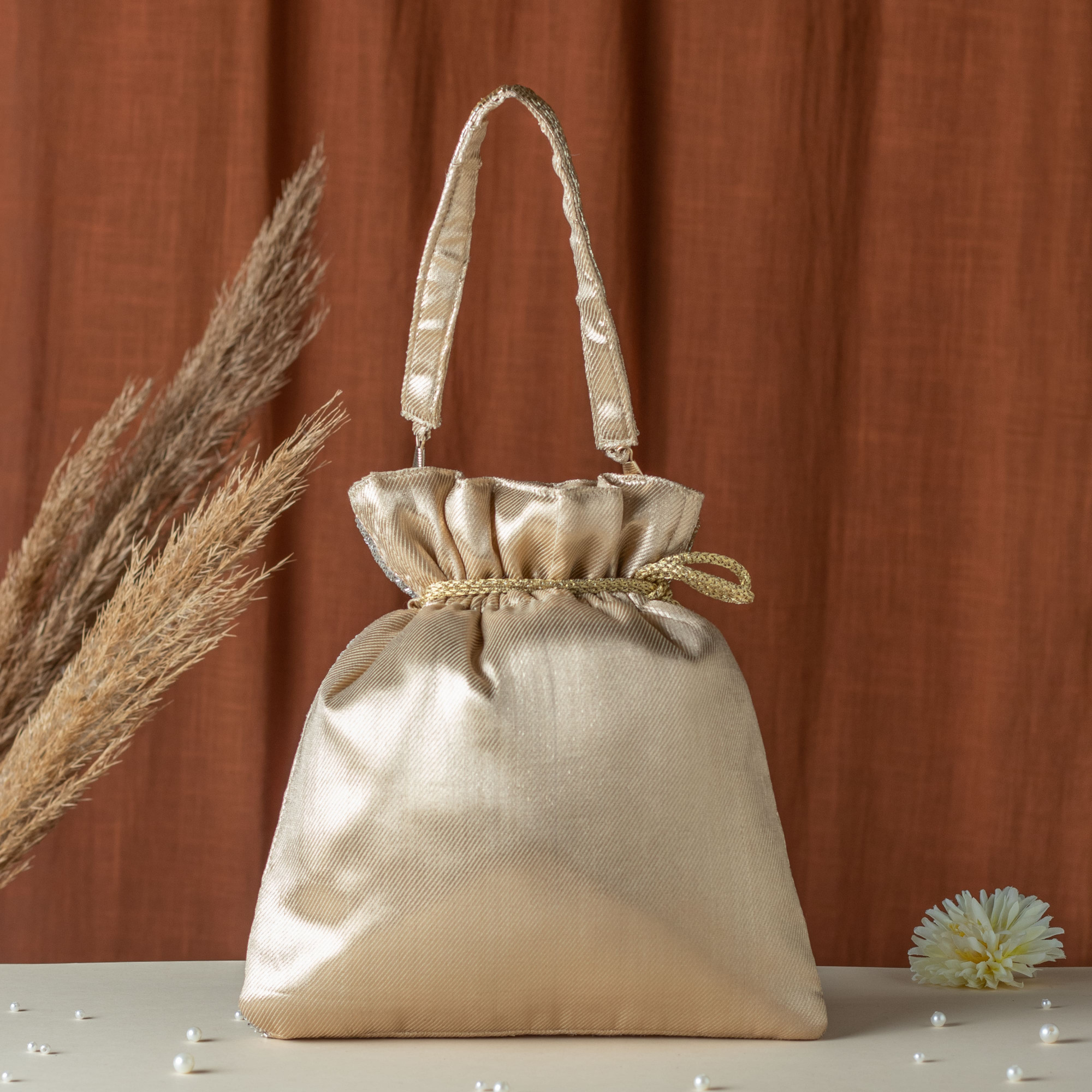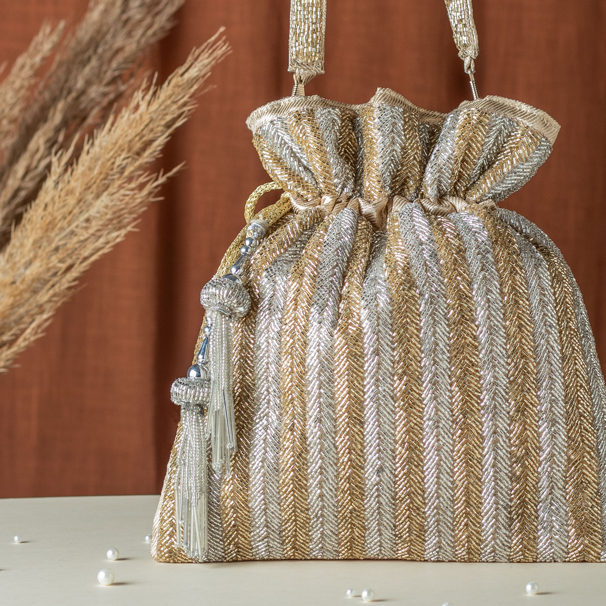 Crafted in luxurious tissue fabric, this potli bag features intricate hand embroidery using golden and silver cut dana, forming a refined striped pattern. Each piece is meticulously handcrafted, making it a statement accessory for Indian celebrations. Beautiful tassels enhance its festive appeal, making it perfect for weddings, festivities, and special occasions.