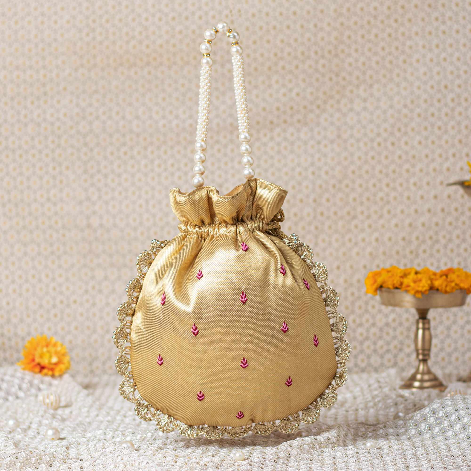 Crafted from premium golden tissue, this potli showcases an artistic Srinathji / Shreenath Ji motif embroidered with delicate pearl and cut-dana work. Lightweight, spacious and beautifully detailed, this potli is perfect for temple visits, festive occasions, wedding gifting and devotional events. A graceful blend of tradition and luxury.