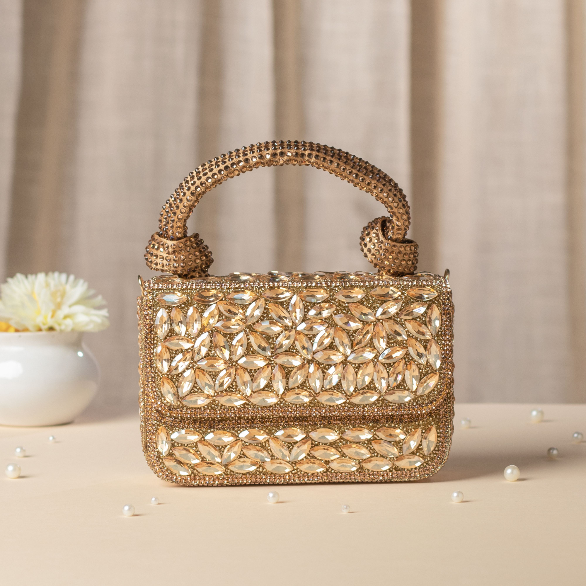 Elegant golden crystal clutch bag with stone embroidery all over, detachable handle and spacious design. Perfect for weddings, parties and luxury gifting.