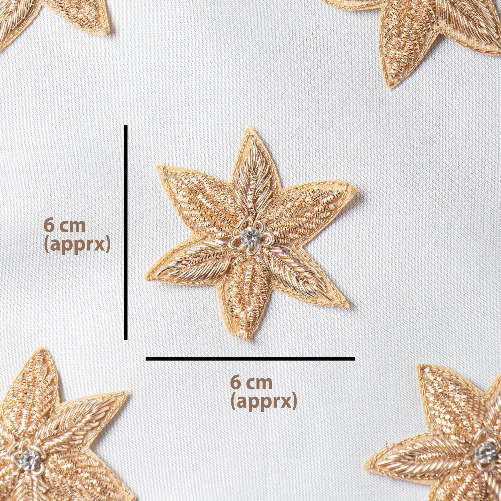 Elevate your ethnic and couture designs with this beautifully handcrafted Zardozi star-shaped applique in an elegant gold finish. Made using premium metallic zardozi threads, this motif features fine detailing, symmetrical design, and a subtle shimmer that adds a luxurious handcrafted touch to any fabric. Perfect for enhancing sarees, blouse sleeves, lehengas, dupattas, potli bags, clutches, and wedding wear, this patch is lightweight, refined, and easy to stitch onto garments or accessories. Its 6 cm compact size makes it ideal for both statement embellishments and clustered design patterns. This premium motif is a must-have for designers, boutique owners, and DIY creators looking to add richness and dimension to their creations.
