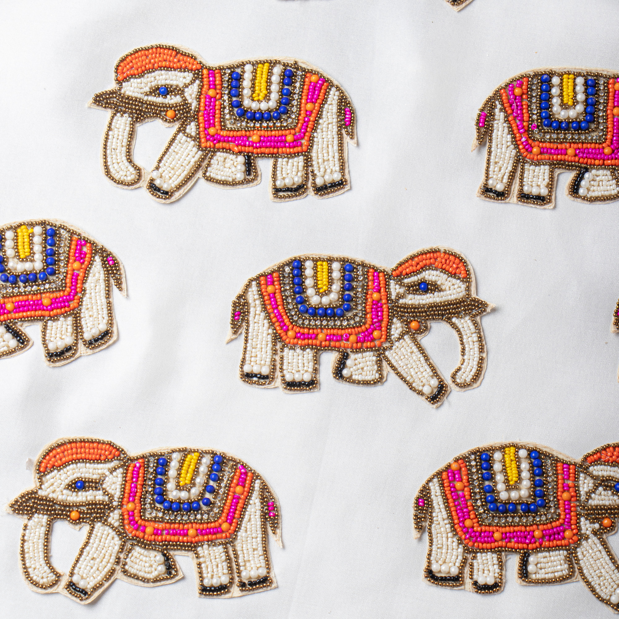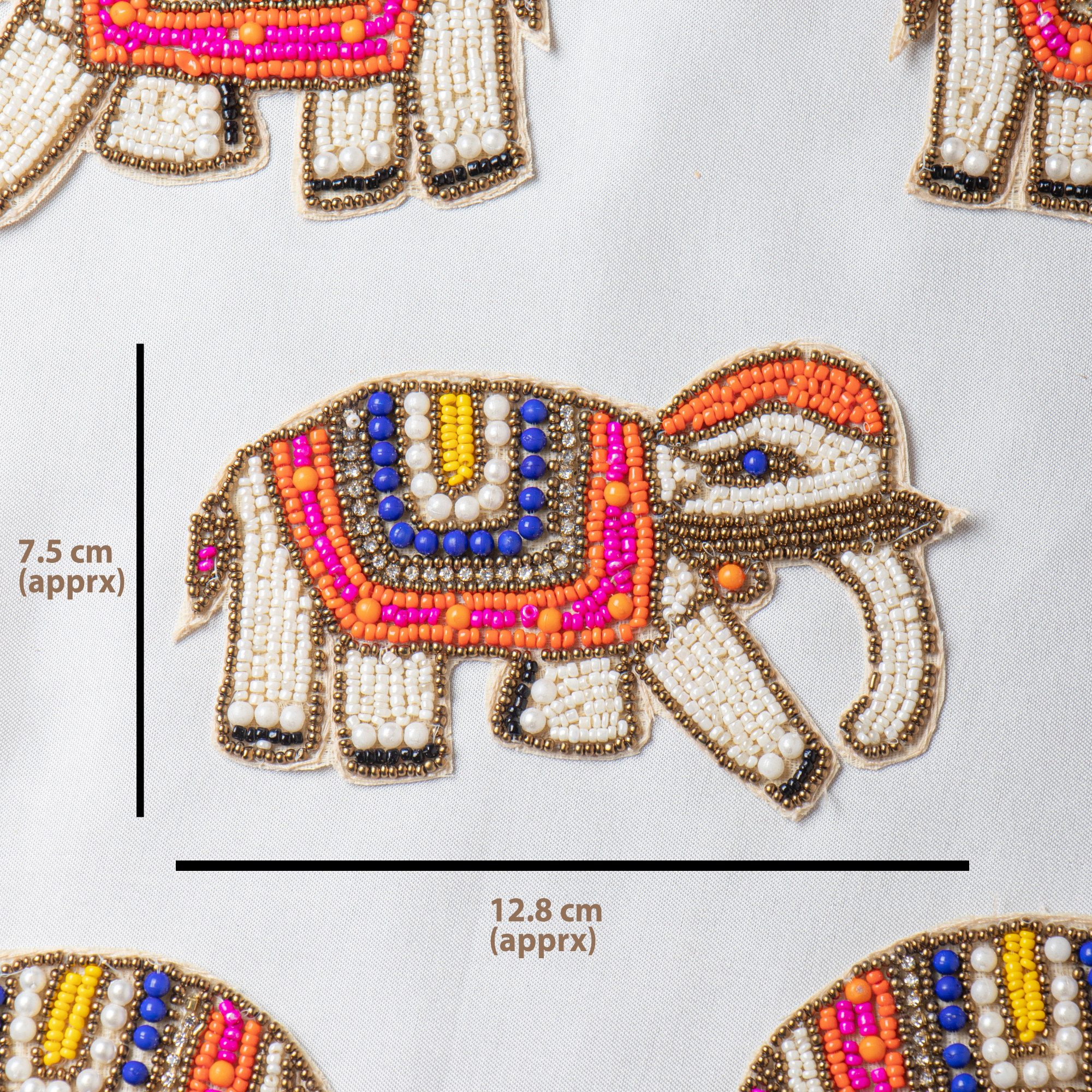 This beautiful hand-beaded elephant embroidery patch is crafted with premium pearls, seed beads, and colorful detail work. Featuring vibrant shades of orange, blue, pink, gold, and white, this applique adds a playful yet traditional charm to any piece it is used on.