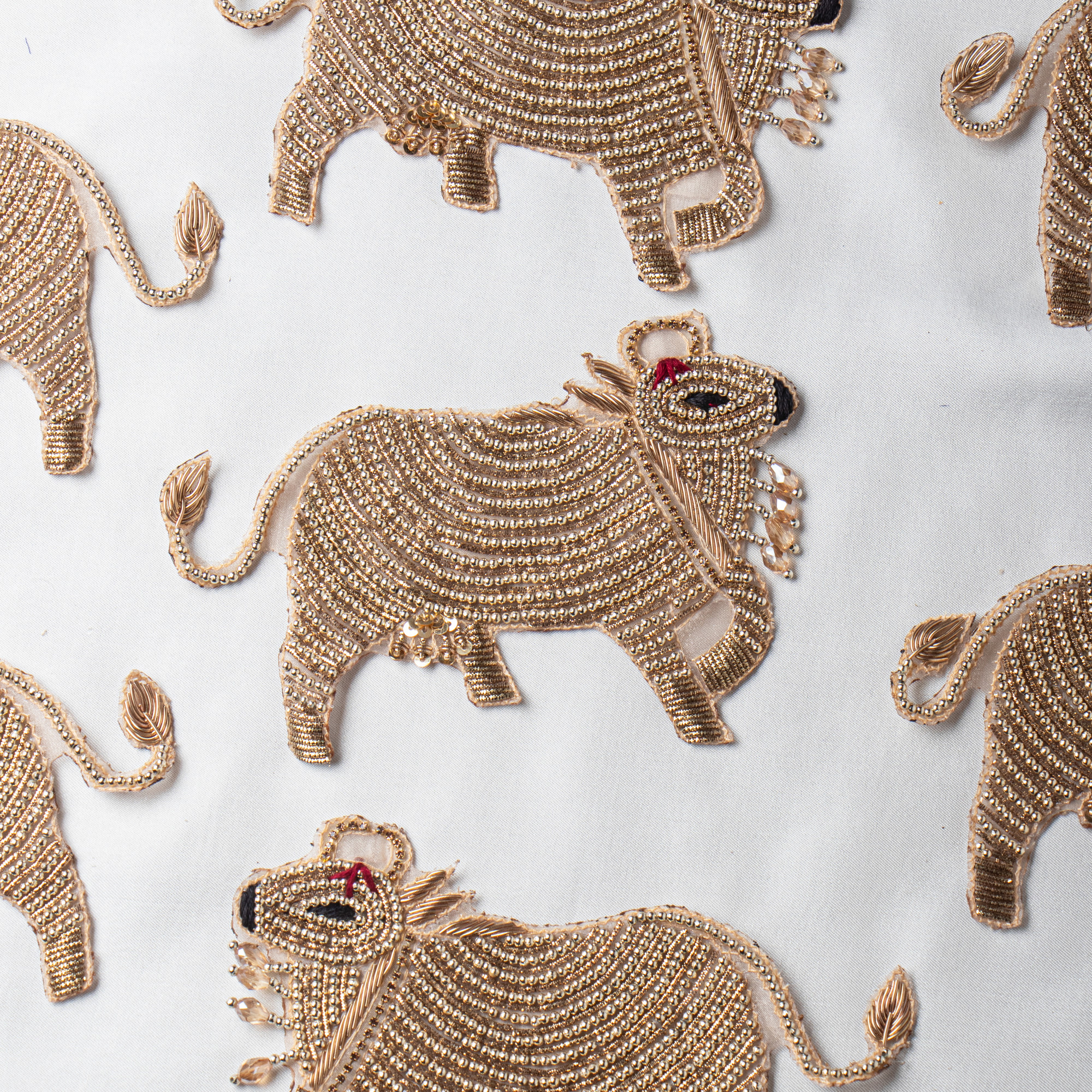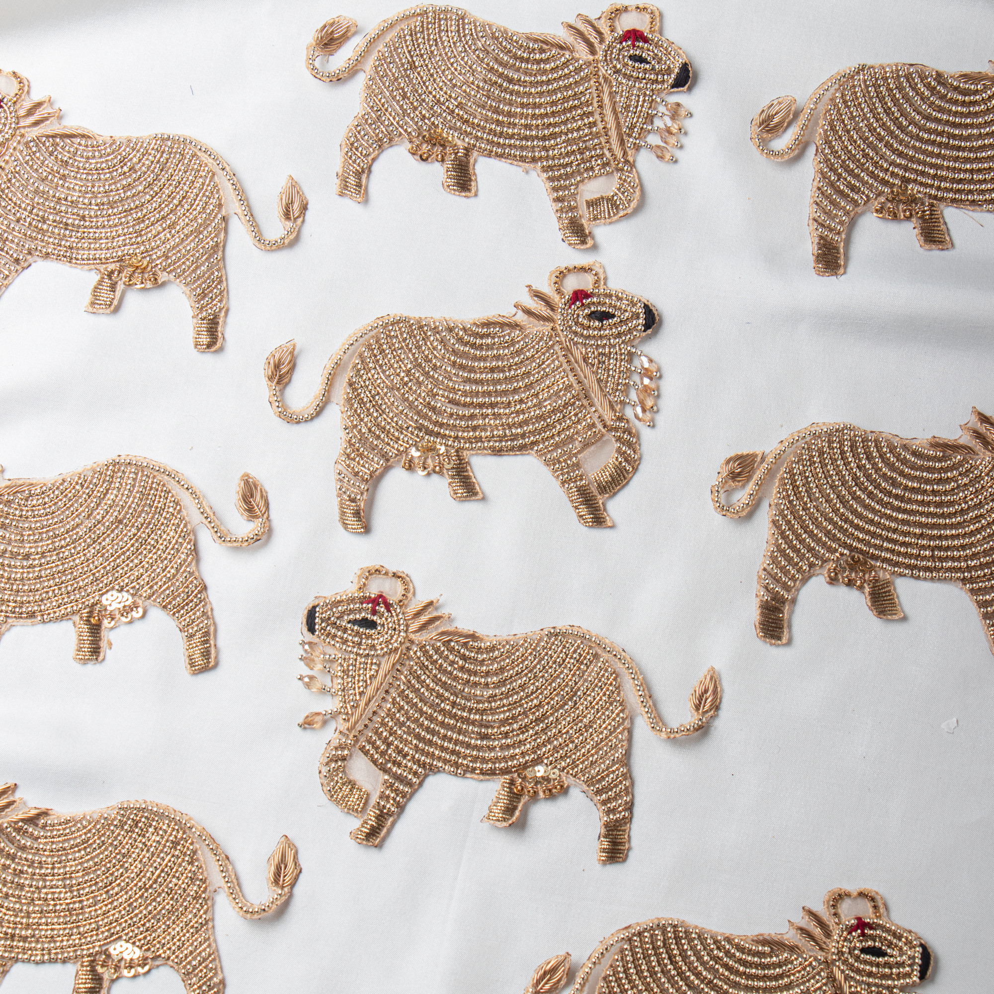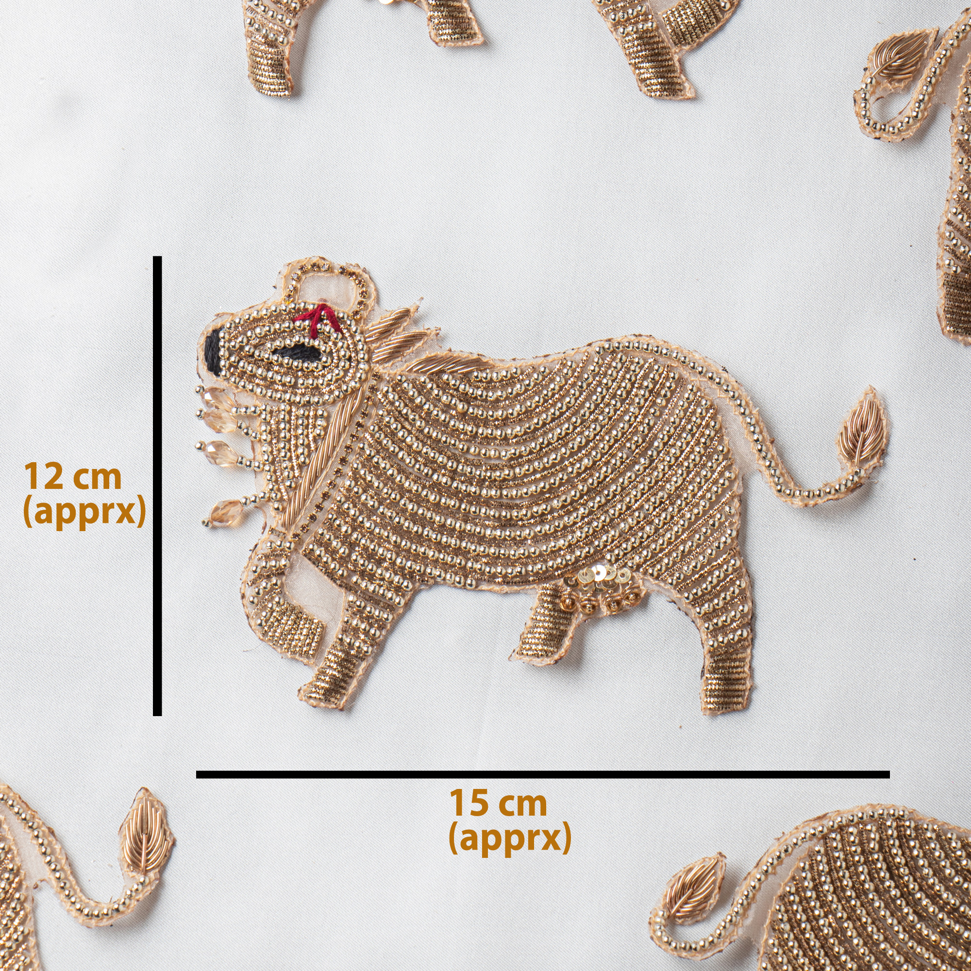 Bring a touch of traditional artistry to your creations with this beautifully handcrafted Gold Beads & Zardozi Bull Motif Patch. Designed in a classic heritage style, this applique combines shimmering gold beads, intricate zardozi work, and detailed handcrafted textures that highlight the richness of Indian craftsmanship. Its 15 × 12 cm size makes it a bold statement piece perfect for designer blouses, lehengas, jackets, dupattas, potli bags, clutches, kidswear, festive outfits, and couture garments. The motif carries a traditional aesthetic inspired by ancient Indian textile art, making it ideal for brands that want to create premium, cultural, or wedding-themed collections. Each piece is carefully hand-embroidered, giving it a luxurious look that stands out on any fabric. Lightweight, durable, and easy to stitch, this patch is perfect for designers and boutique creators aiming for a high-end ethnic finish.