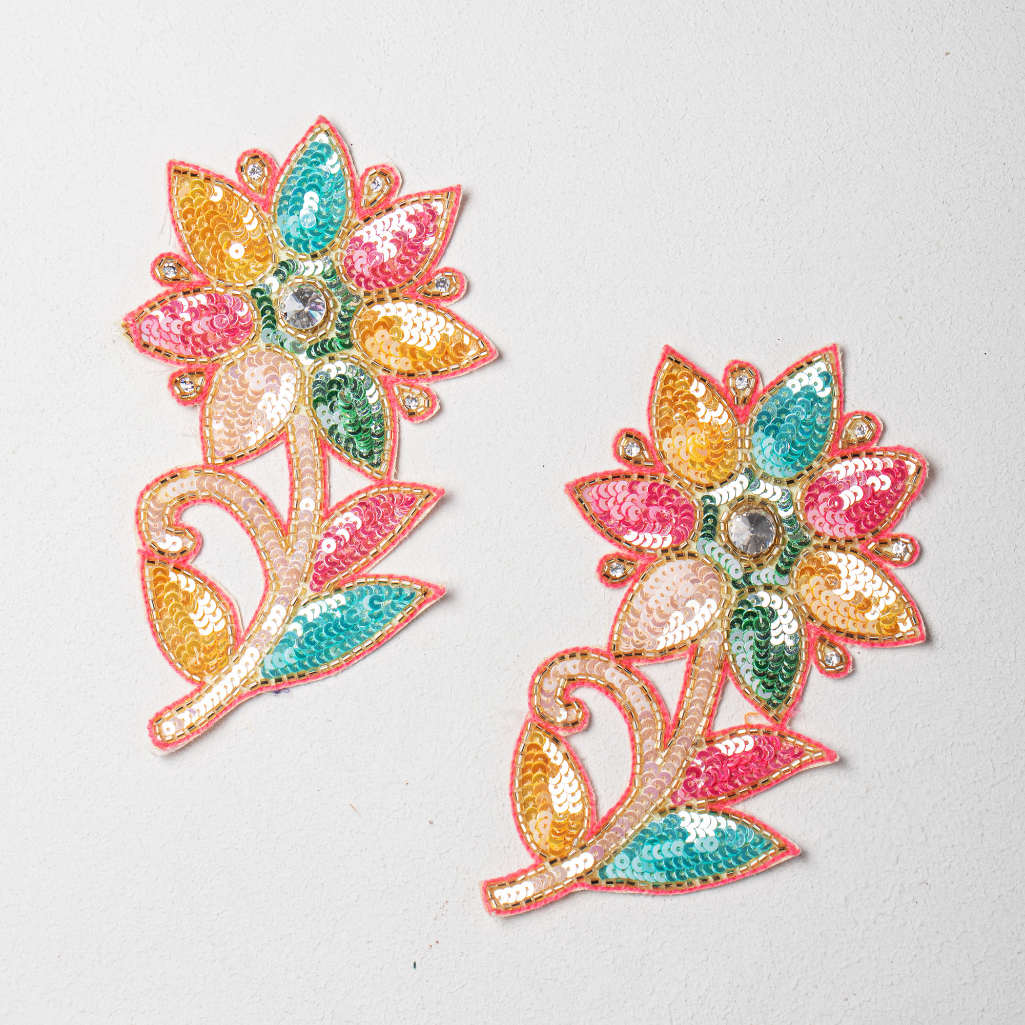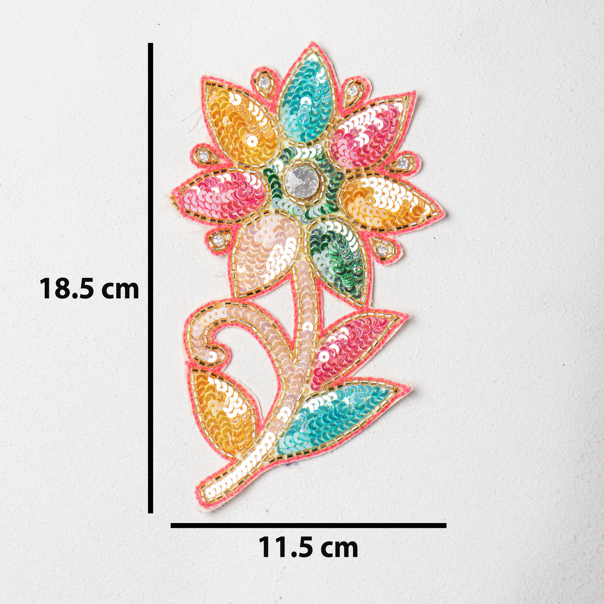 Add a luxurious handcrafted touch to your garments and craft creations with this Premium Multicolor Floral Embroidery Patch, beautifully designed using high-quality sequins and katdana beadwork. The elegant floral shape combined with sparkling multicolor detailing makes it a standout embellishment for bridal couture, festive outfits, designer wear, accessories and creative DIY projects. This applique is hand-embroidered with precision, giving it a shine-rich, premium couture finish. It is flexible, lightweight, and easy to apply using hand stitching or fabric glue, making it suitable for both fashion and decorative craft work.