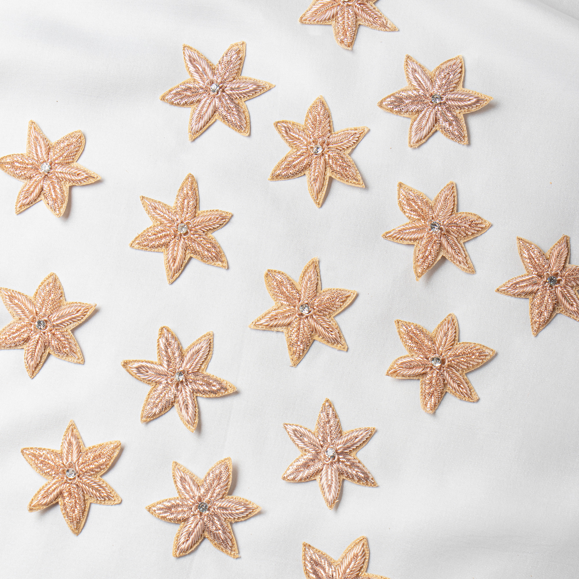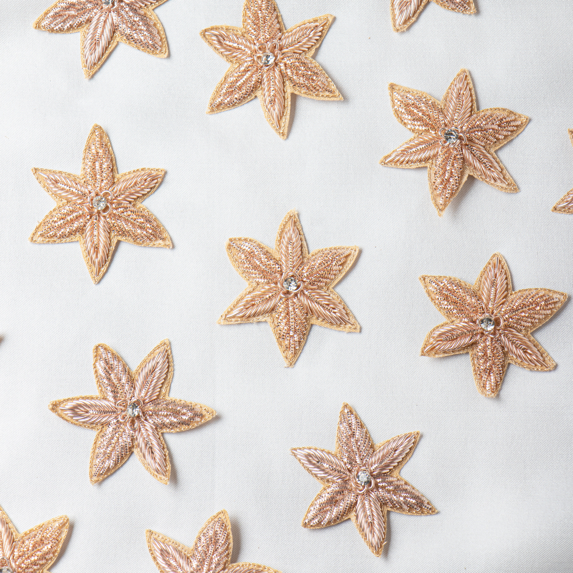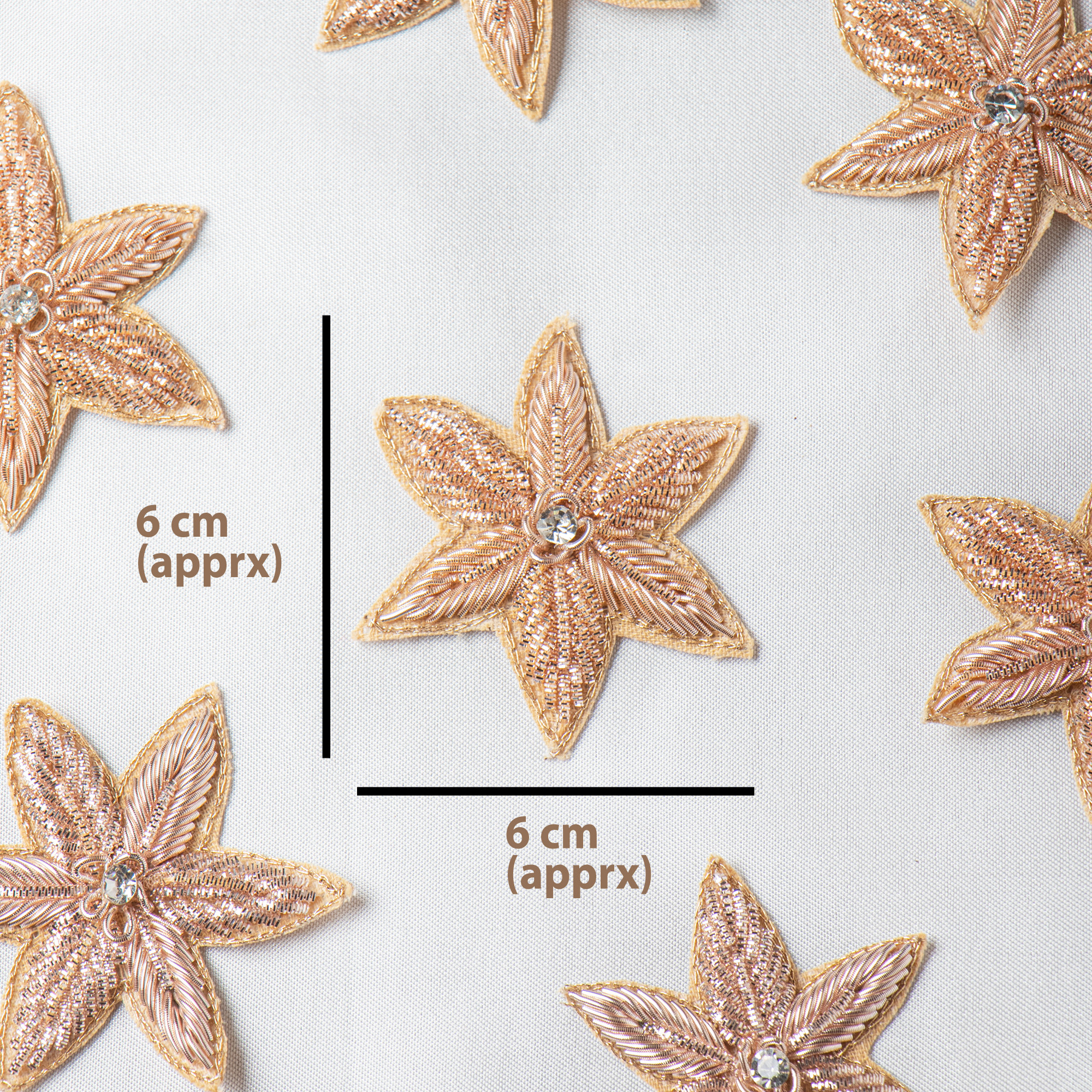 Add a modern, luxurious charm to your garments with this exquisite Rose Gold Zardozi Star Patch, thoughtfully handcrafted using fine metallic threads. This 6 cm applique stands out with its soft rose–gold sheen and a sparkling crystal centre, giving it a refined, contemporary look perfect for premium ethnic and fusion fashion. Each petal is embroidered with detailed zardozi work, creating a high-end texture that instantly elevates any outfit. Whether you are designing saree blouses, lehengas, dupattas, kurtis, potli bags, or couture accessories, this patch adds a sophisticated highlight without overpowering the design. Lightweight, durable, and easy to stitch, it’s ideal for boutique designers and DIY creators looking to introduce a classy rose-gold finish to their creations.