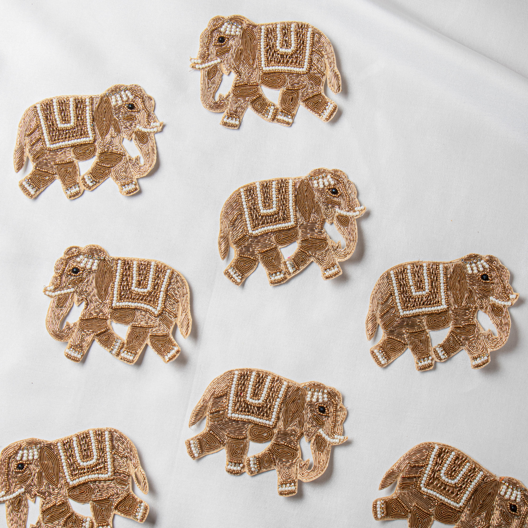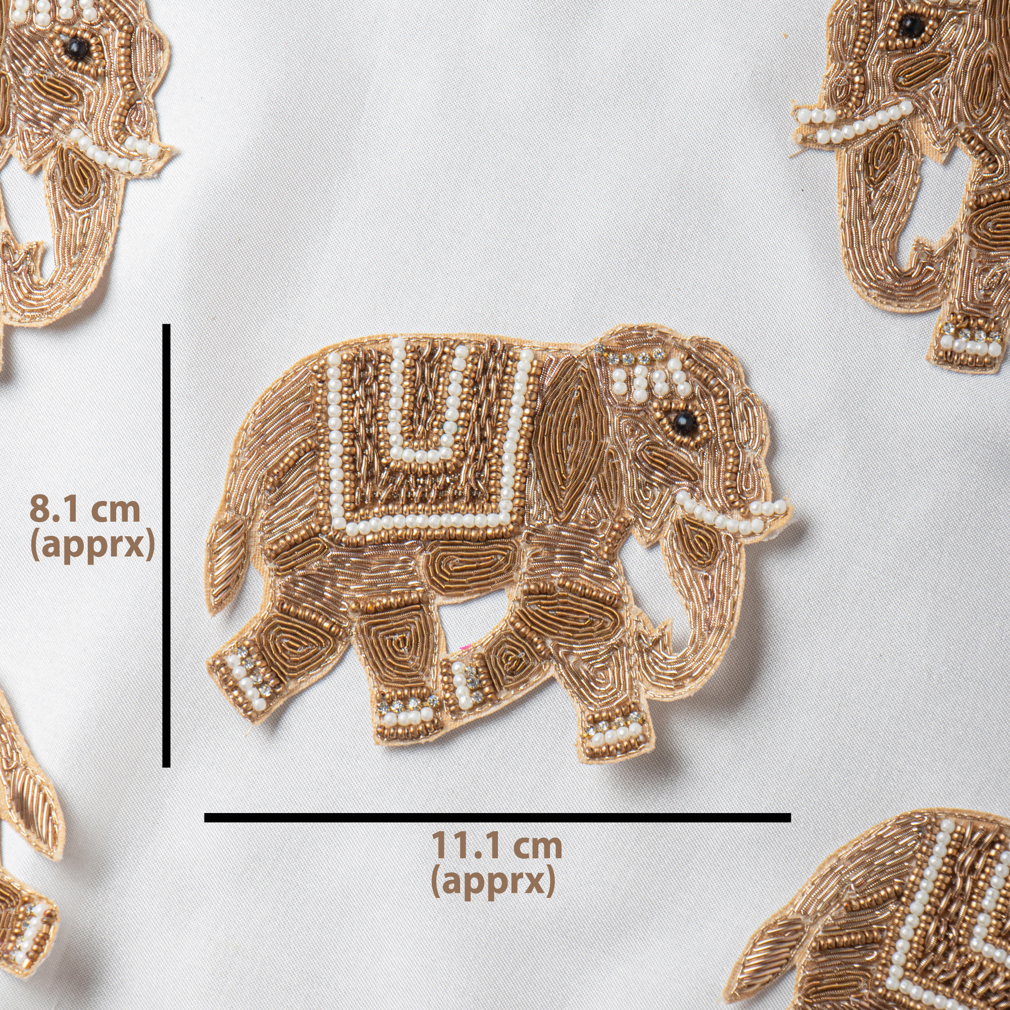 The intricate metallic threadwork, paired with pearl-like beads and delicate craftsmanship, makes this elephant motif perfect for festive wear, couture garments, accessories, and home décor projects. Ideal for saree blouses, lehengas, jackets, bags, cushion covers, wall art, and premium DIY creations.