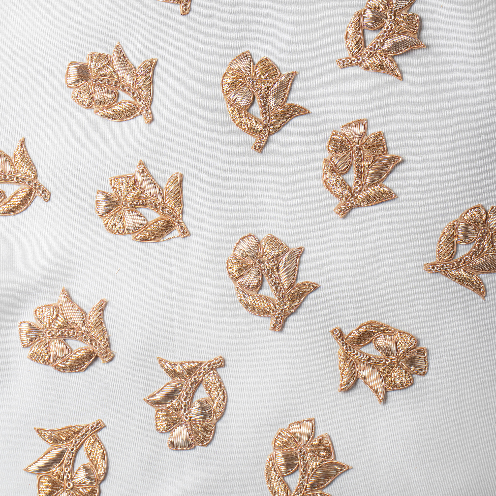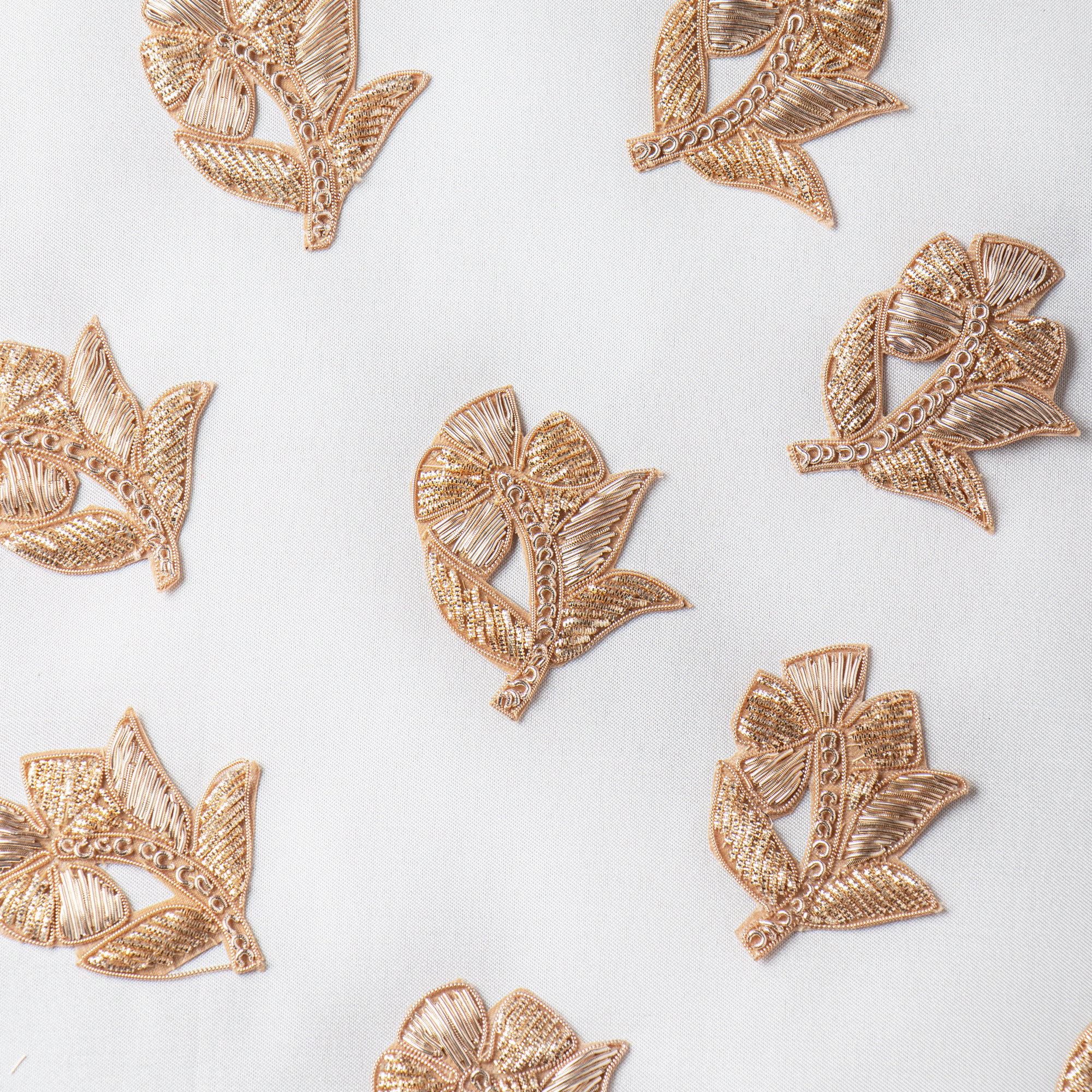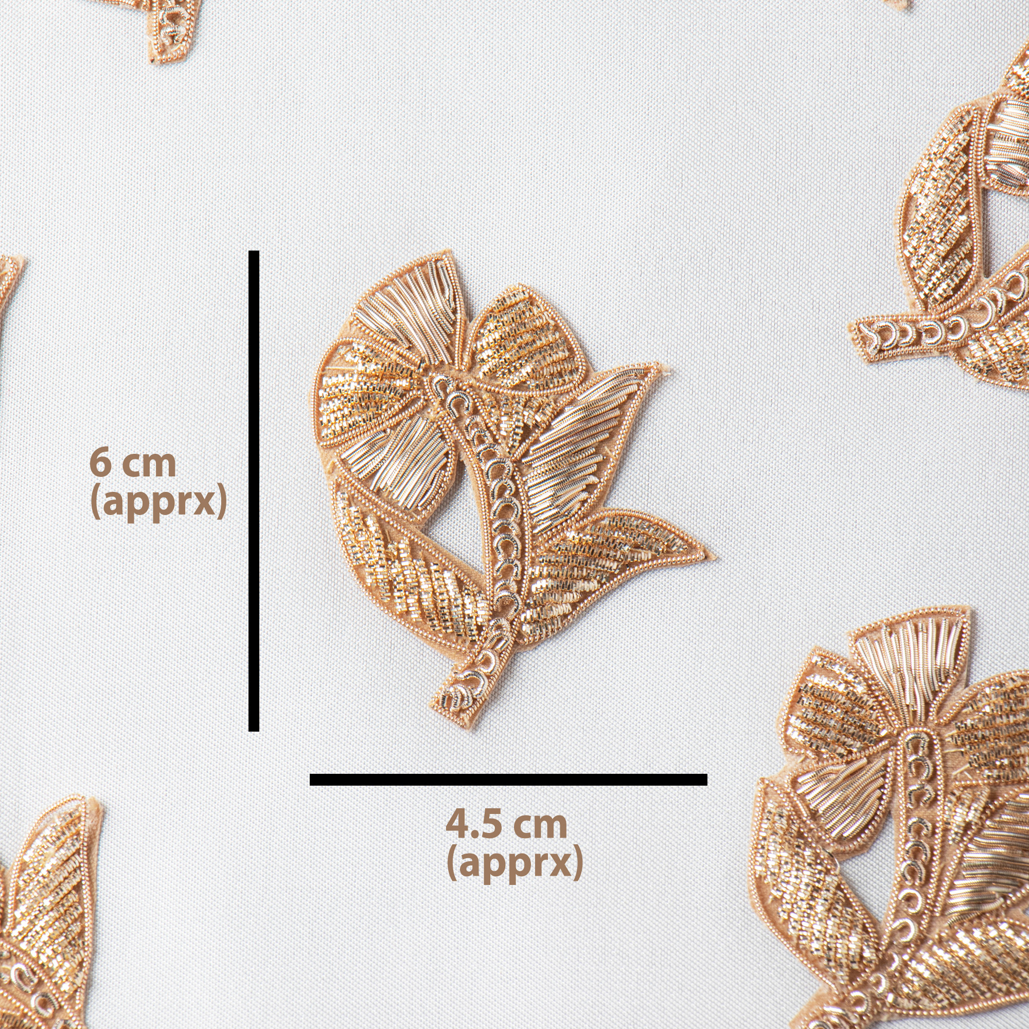 Enhance your ethnic and designer creations with this set of 10 handcrafted Zardozi leaf appliques. Made with detailed golden thread and beadwork, each patch adds a luxurious touch to any fabric. The compact size makes it perfect for both small accents and cluster designs. These appliques are ideal for bridal outfits, designer wear, accessories, and DIY projects—giving your products a premium handcrafted look.
