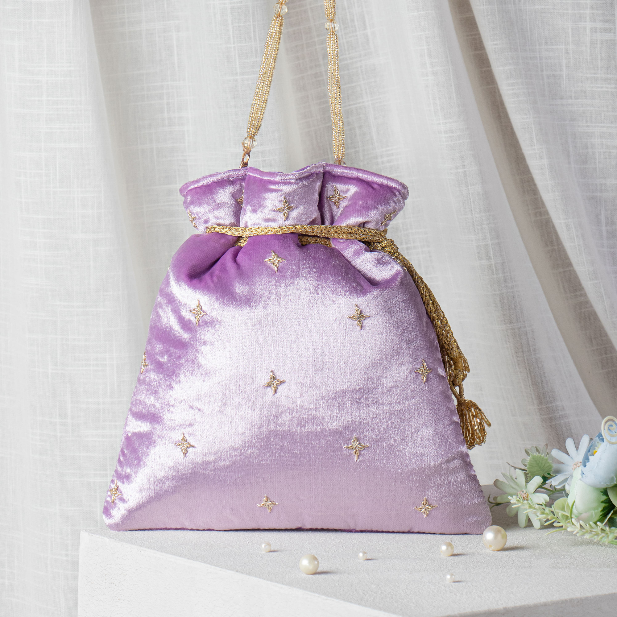 This elegant lavender Potli Bag is crafted on premium velvet fabric and features intricate Zardozi embroidery enhanced with sequins and pearls. A graceful pearl-beaded handle lends a refined and luxurious touch. The drawstrings are finished with tiny tassel detailing, elevating the handcrafted appeal. Designed to be both stylish and functional, it comfortably holds your essentials. Perfect for weddings, festive occasions, and special celebrations. Available in multiple colors with the same detailed craftsmanship.