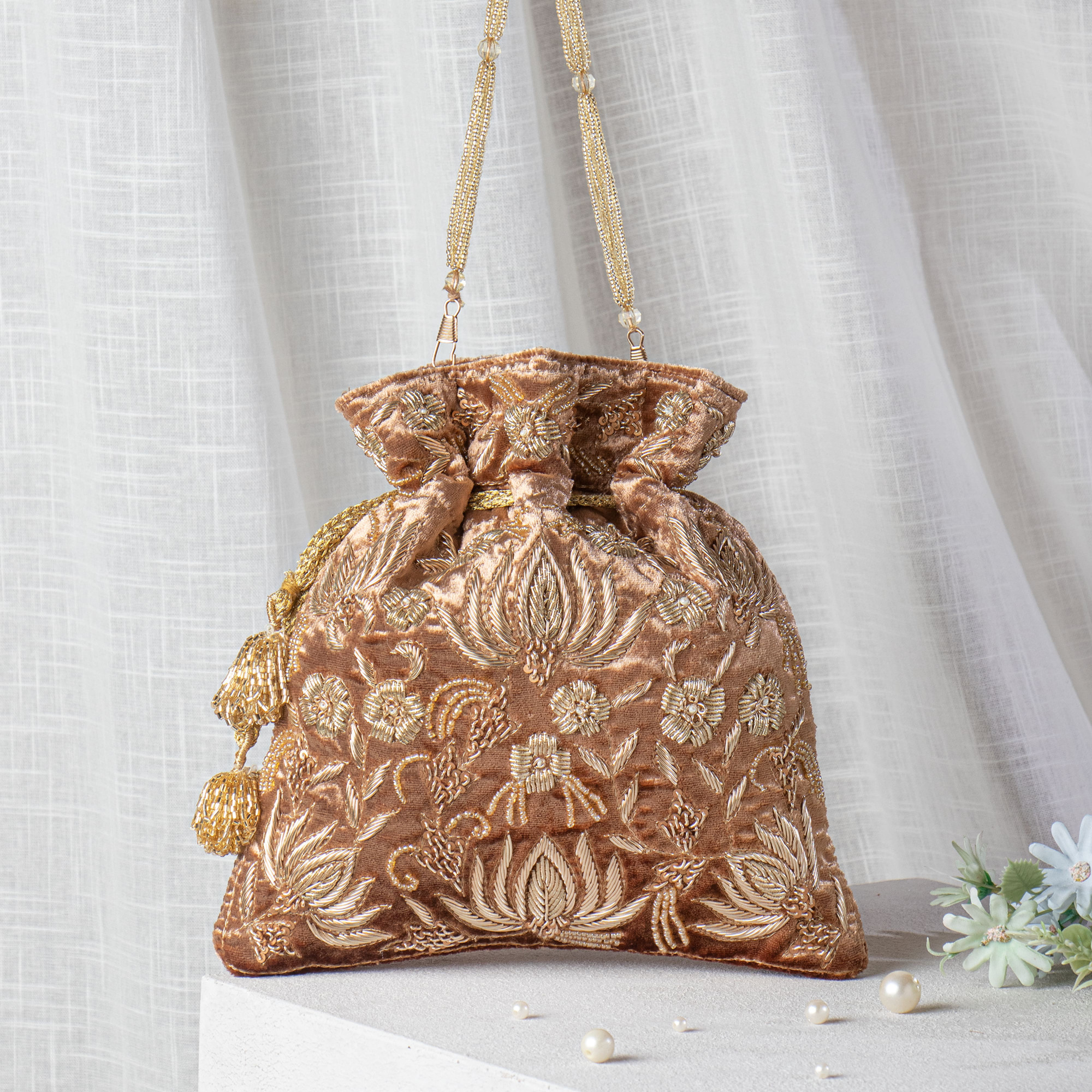 This elegant mocha brown Potli Bag is crafted on premium velvet fabric and features intricate Zardozi embroidery enhanced with sequins and pearls. A graceful pearl-beaded handle lends a refined and luxurious touch. The drawstrings are finished with tiny tassel detailing, elevating the handcrafted appeal. Designed to be both stylish and functional, it comfortably holds your essentials. Perfect for weddings, festive occasions, and special celebrations. Available in multiple colors with the same detailed craftsmanship.