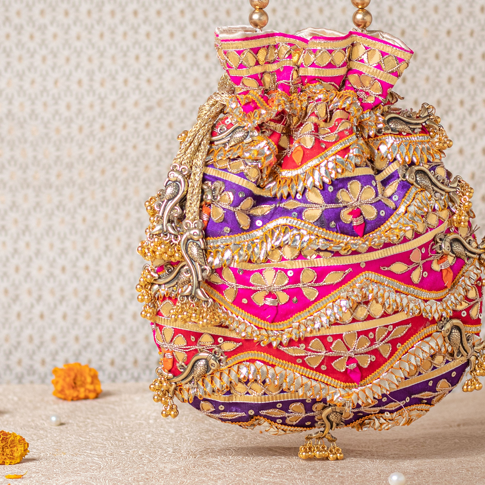 This striking Purple–Pink–Red potli is crafted with intricate traditional detailing. Featuring premium gota patti work, the bag is adorned with signature peacock metal charms. Soft satin lining and a pearl handle complete the royal look.