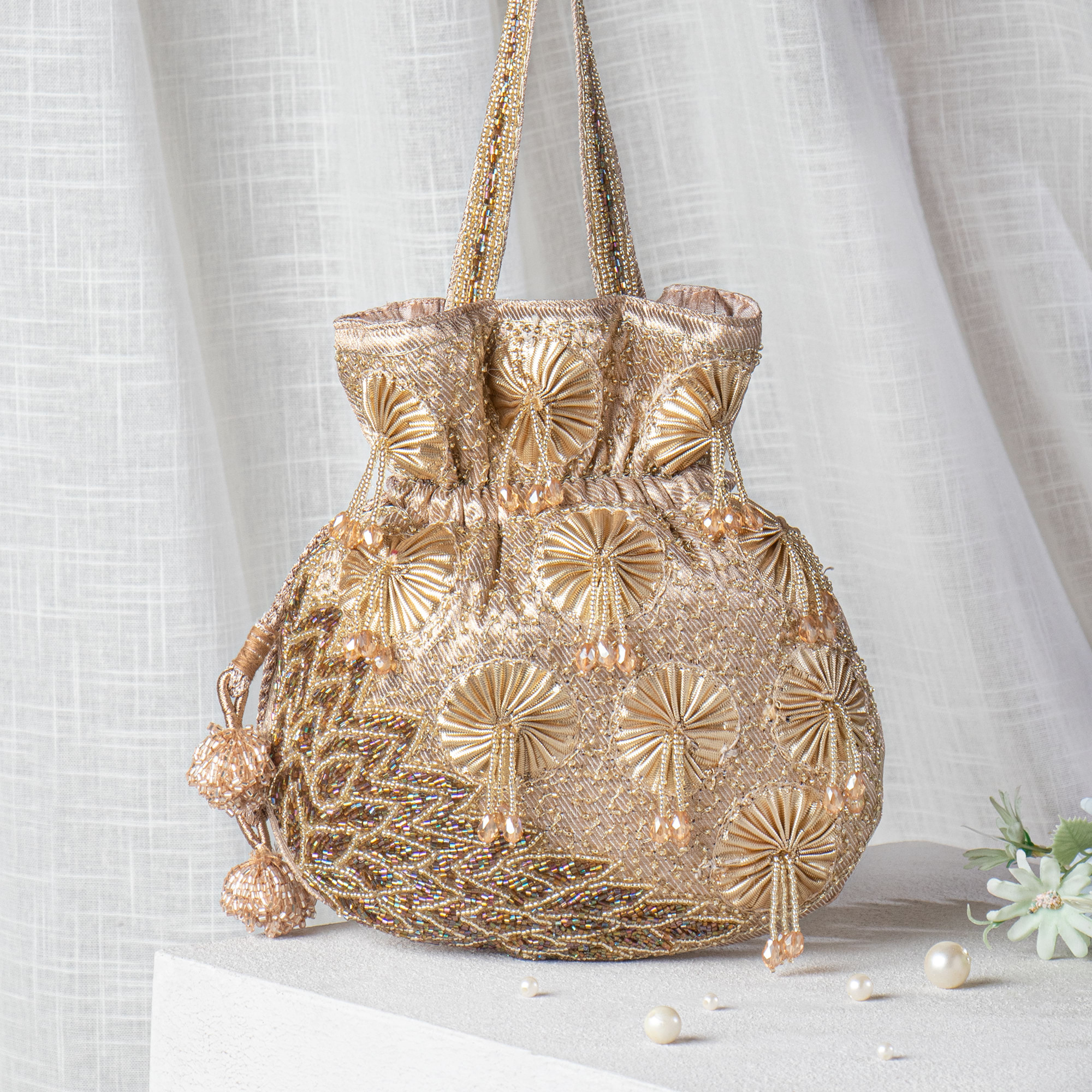Designed to stand out, this rose gold potli bag is crafted in premium tissue fabric and finished with exquisite hand embroidery. Detailed with gota floral motifs, cut dana, and pearls, it reflects fine craftsmanship and a unique design concept. The potli comes with delicate tassels and a fabric handle enhanced with handwork for added elegance. Fully lined on the inside, it offers a neat and durable finish. An ideal accessory to style with sarees, lehengas, and Indian ethnic wear.