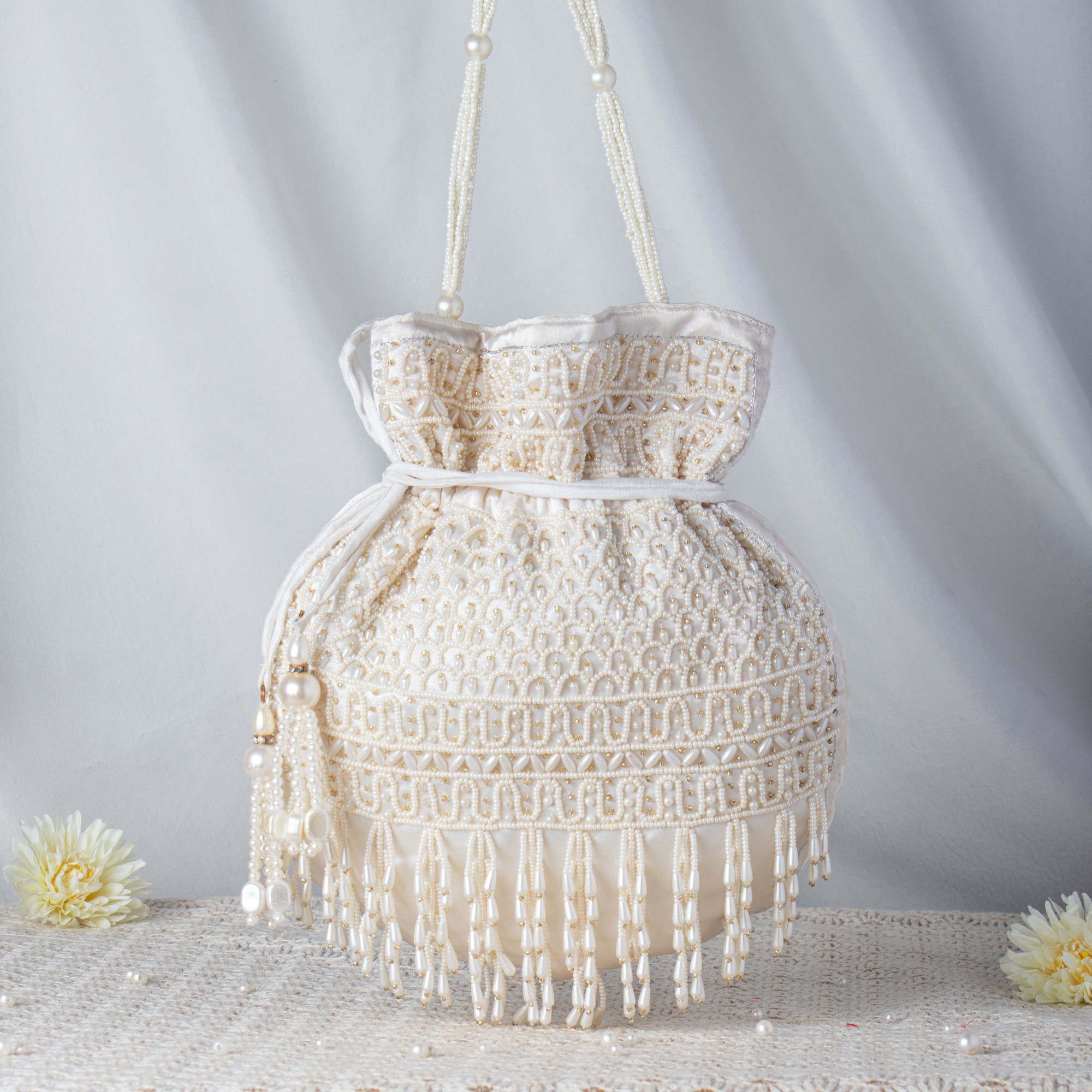Design: A breathtaking vision in ivory, this luxury potli features a premium satin base meticulously hand-embellished with intricate pearl work and glass beads. The highlight is the stunning "Waterfall" beaded fringe that creates a tiered, shimmering effect, adding fluid movement and a regal touch to the silhouette. Versatility: Equipped with a sophisticated matching pearl-beaded handle, this bag is designed to be carried elegantly on the wrist. The timeless "All-White" aesthetic makes it a versatile masterpiece that seamlessly complements traditional Indian bridal lehengas, Nikkah ensembles, and modern white wedding gowns. Space: Thoughtfully engineered to provide a roomy interior, it is perfectly sized to hold your smartphone, luxury lipstick, car keys, and other essential wedding day items without losing its shape. Closure: Features a secure, smooth-glide drawstring system accented with exquisite oversized pearl tassels (latkans) and golden bead caps for a truly premium, high-fashion finish. Occasion: The ultimate choice for "The Modern Bride." This statement accessory is ideal for Christian weddings, grand receptions, sangeet ceremonies, or any high-glamour festive event.