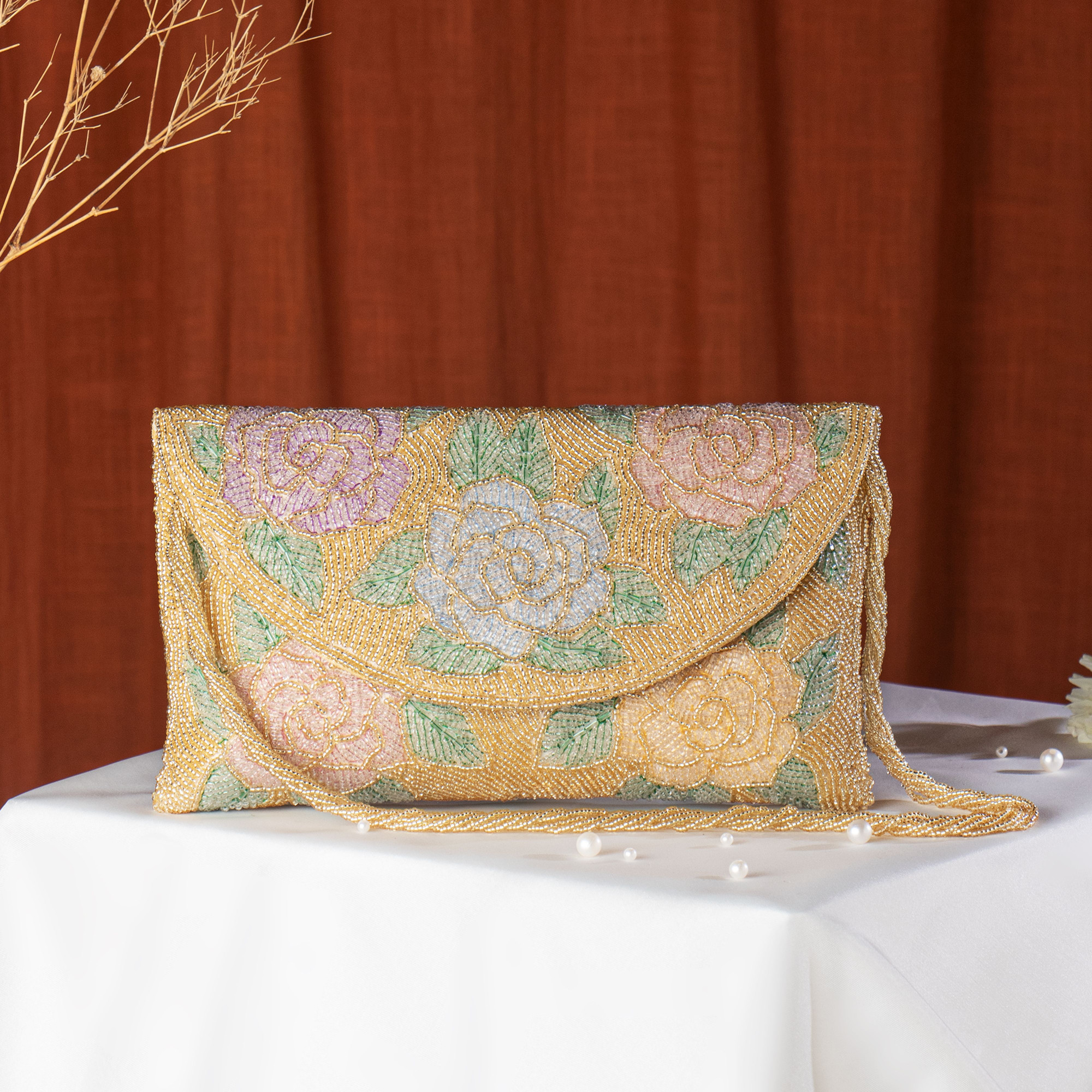 Gold Hand-Beaded Floral Bridal Clutch Bag