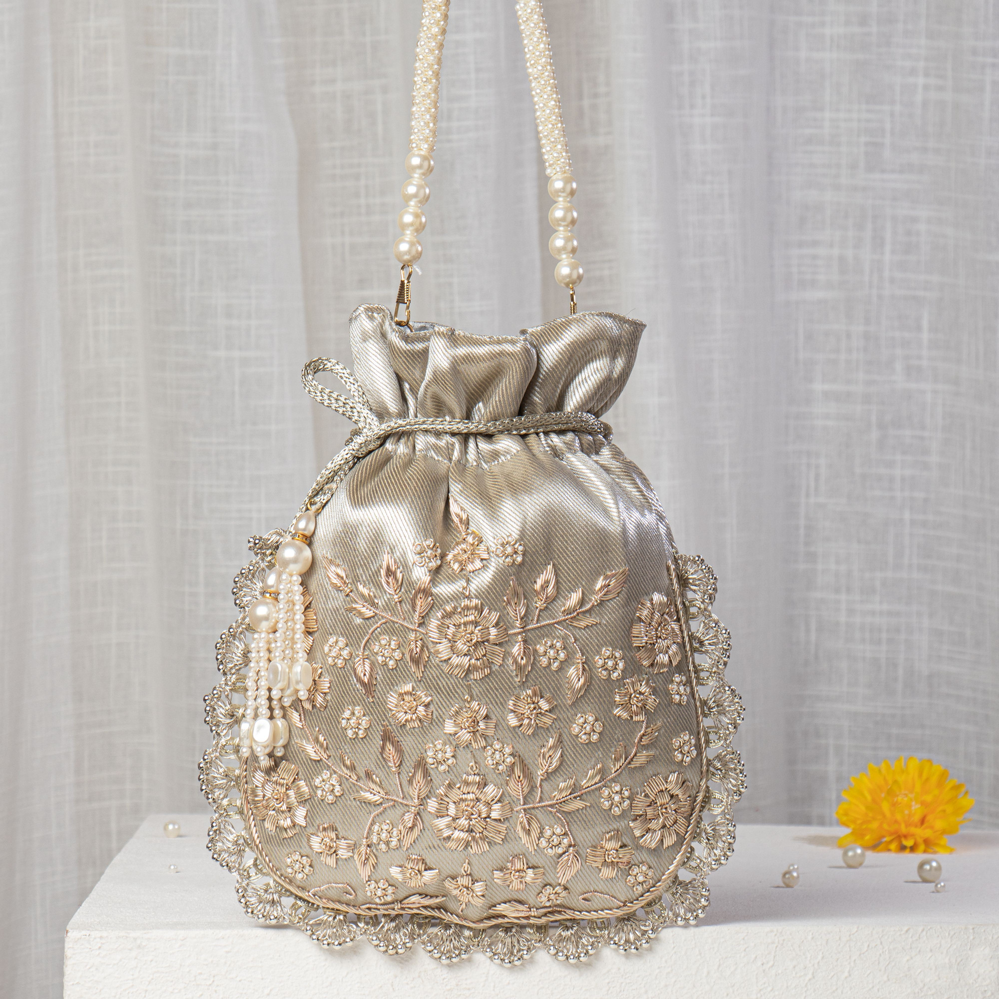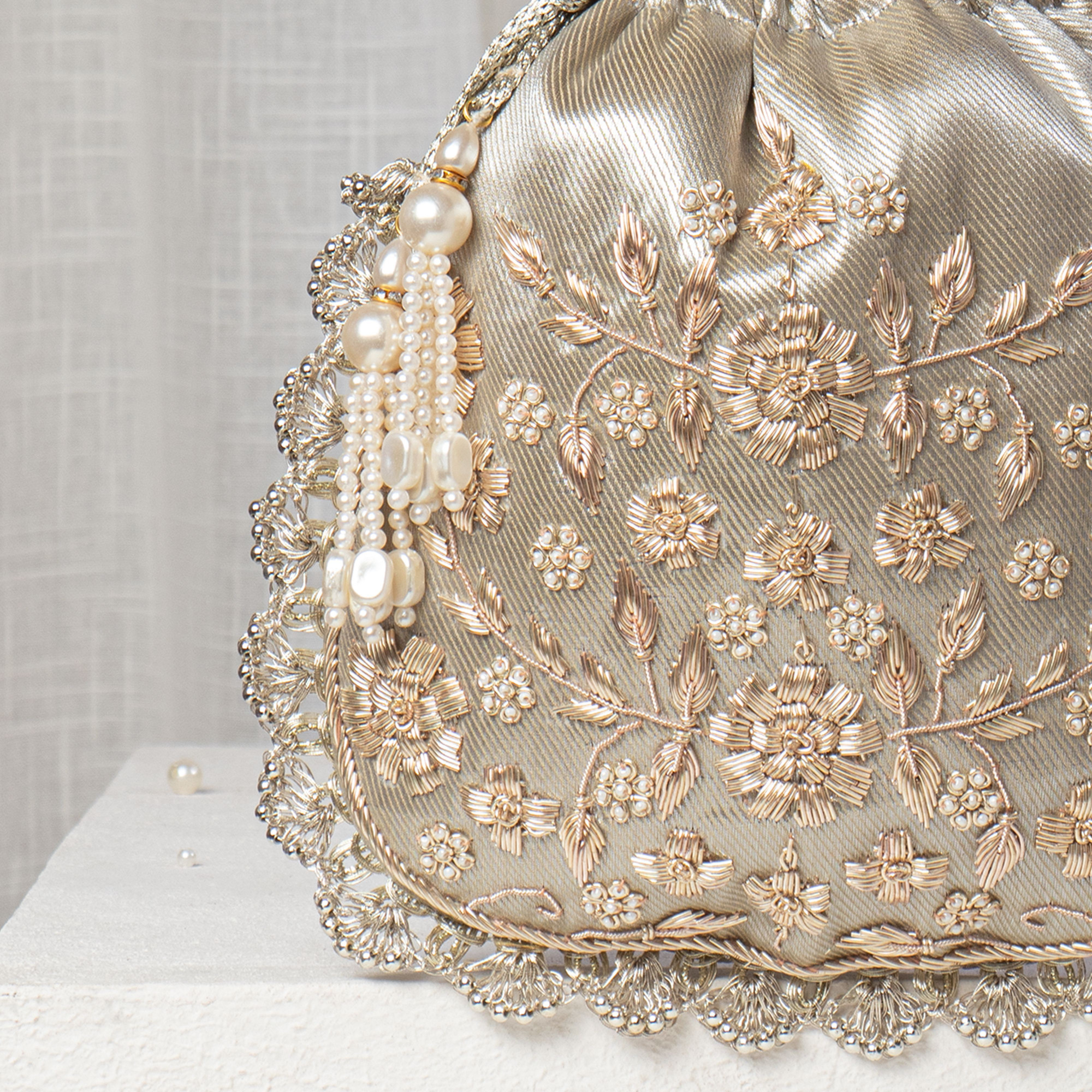 Design: Crafted from high-quality, shimmering Champagne Silver-Gold Silk fabric featuring an exquisite and intricate floral jaal thread embroidery that adds a traditional yet royal touch to your look. The design is elevated by delicate pearl highlights and a signature hand-beaded scalloped border for a refined, modern-ethnic aesthetic. Versatility: Designed with a classic drawstring closure and a premium double-strand pearl handle, making it easy to carry as a stylish handheld accessory for any ethnic outfit, from silver-work lehengas to elegant silk sarees. Space: Thoughtfully sized to comfortably hold your celebration essentials, including a large smartphone, makeup touch-ups, keys, and cash. Closure: Features a smooth, reinforced metallic drawstring mechanism with decorative pearl-fringe tassels to ensure your belongings stay secure while adding a festive flair. Occasion: An ideal choice for contemporary Indian weddings, high-end cocktail parties, or as a sophisticated shagun bag for Gifting. Perfect for Brides and guests seeking a subtle yet glamorous statement.