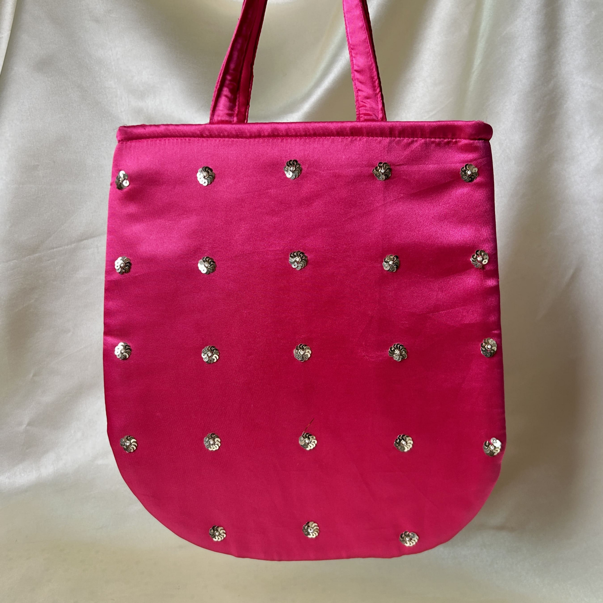 Vibrant Magenta Pink Hand-Embroidered Radha-Krishna Satin Silk Handbag with French Knot Detailing